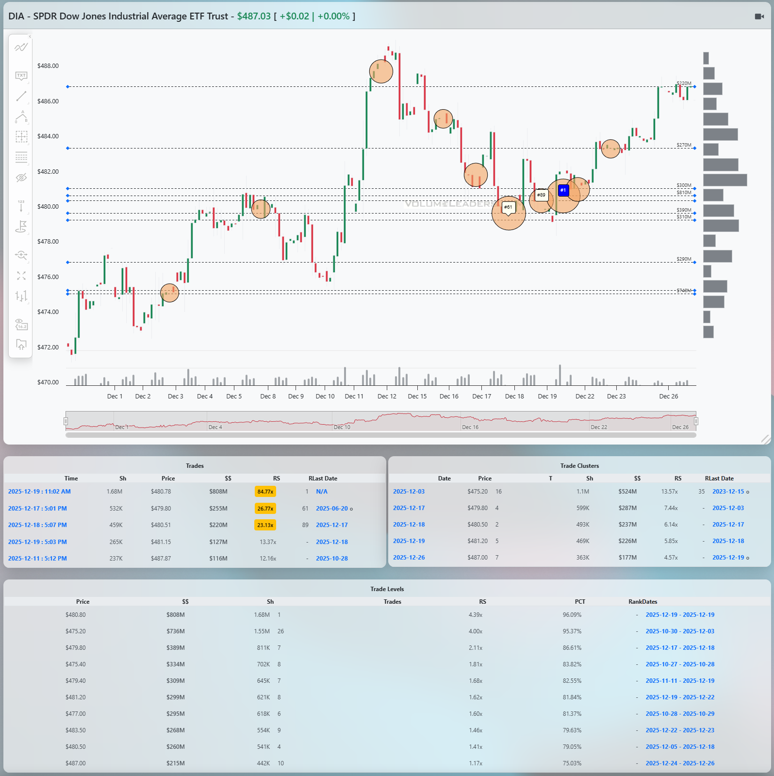 DIA has quietly been the most technically complete. The early December rally was strong, followed by a controlled pullback into the high 470s. Multiple large trades printed around 479 to 481, including a notable cluster with high percentile readings, and price held. From there, DIA resumed higher, reclaiming 483, then pushing into the upper 480s. The Levels table shows a dominant notional shelf centered around 480, with RS above 4x and percentile readings in the mid to high 90s. That is real sponsorship. Price is now hovering near 487 to 488, just under prior highs. The key is behavior, not direction. As long as DIA holds above 480, pullbacks are corrective. Acceptance above 488 would confirm another leg higher. A failure back through 478 would be the first real warning that this structure is breaking.
