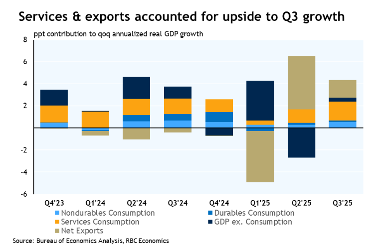 That stabilization in rates mattered because it followed one of the most important macro data points of the quarter. On Tuesday, U.S. Q3 real GDP was reported at +4.3% quarter-over-quarter annualized, well above expectations of +3.3% and stronger than Q2’s already solid +3.8%. This was the fastest pace of U.S. economic growth in two years, and it reset the tone for the entire week. Markets were reminded that the economy is not merely avoiding recession, but expanding at a pace that supports earnings, risk-taking, and confidence in forward growth.