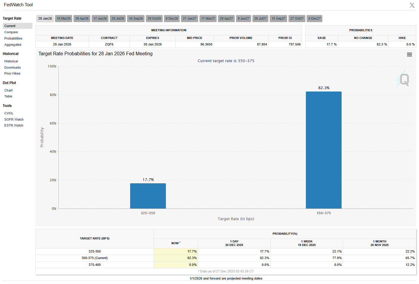 This was a market that did its work earlier in the week and then coasted. By Friday, momentum had cooled, volumes thinned, and traders were content to protect gains rather than press new bets into a weekend filled with geopolitical headlines and a holiday calendar. The underlying tone, however, remained constructive. The 10-year Treasury note yield fell -0.6 basis points on Friday to 4.128%, providing a subtle but important tailwind for risk assets. At the same time, rate expectations stopped deteriorating. Market-implied odds for a -25 basis point rate cut at the January 27-28 FOMC meeting crept back up to 20%, rebounding from a low of 13% seen earlier in the week.