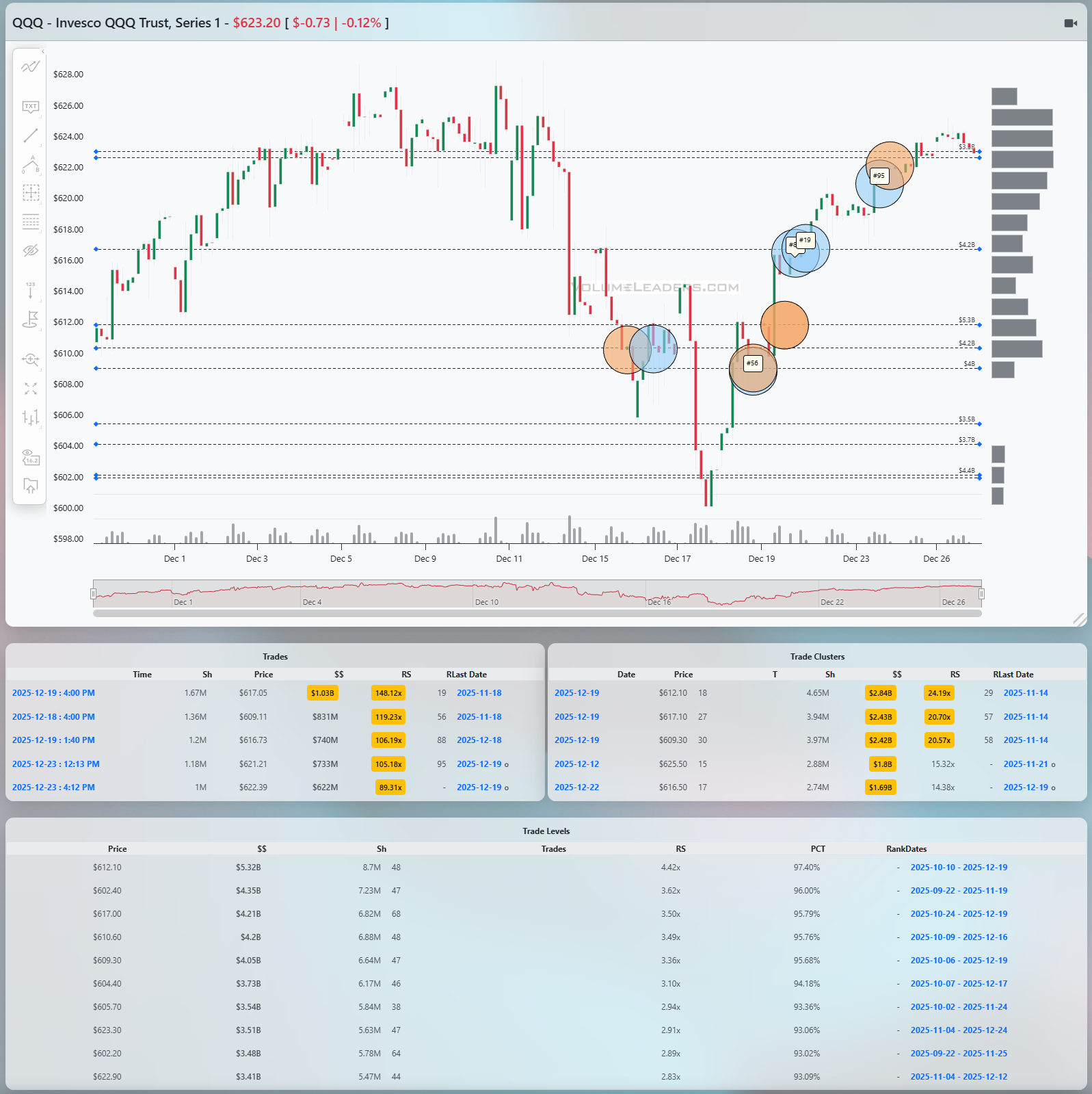 QQQ followed a similar script, but with more volatility. The first half of December pushed higher into the mid-620s before rolling over sharply. The selloff was deeper here, driving price down toward the 600 to 605 area. That low was not subtle. Several very large trades printed between roughly 602 and 610, including a tagged top-100 print around 610, and price snapped higher almost immediately. That response tells you the liquidation found a buyer with patience and size. The recovery phase reclaimed the 610s, then the 616 to 618 shelf, where multiple clusters with elevated RS formed. The most important takeaway from the Levels table is that the heaviest dollar-weighted levels now sit between roughly 610 and 617, not at the highs. That is constructive, because it means value migrated higher rather than chasing price at the very top. QQQ is now pressing into the low 620s, where prior balance existed. Acceptance above 623 to 625 would signal continuation toward the mid-620s and potentially higher. Rejection back below 616 would shift this back into a rotational regime rather than a trend.