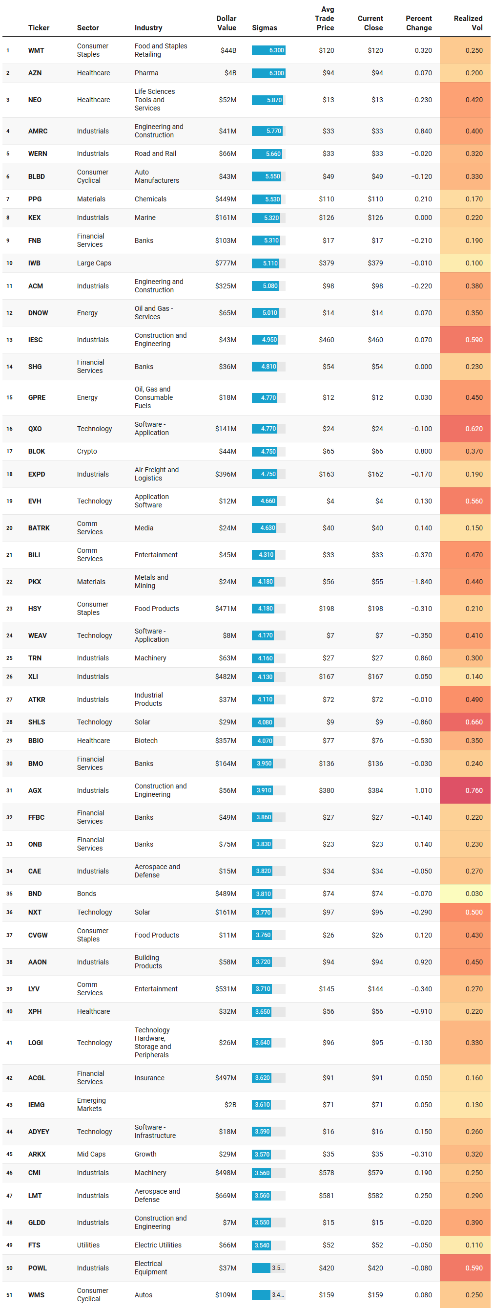Industrials stand out for their consistency. Aerospace and defense, engineering, specialty manufacturing, and logistics-related names populate the top ranks, reinforcing the idea that institutions are leaning into tangible output, infrastructure, and long-cycle demand. This leadership dovetails with the industrial-heavy activity seen in the institutional outliers list and supports the thesis that this rotation is intentional and multi-week in nature.