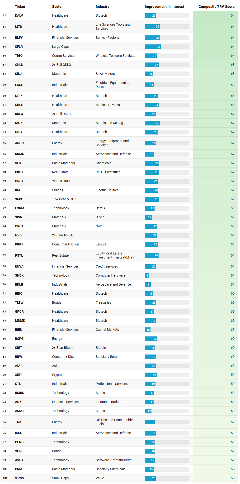 TRV is a proprietary metric that measures the recent acceleration or deceleration in institutional trading activity for a given stock by comparing its average trade rank over the past few days to its average in recent weeks. A sharp improvement in TRV typically reflects a notable shift in positioning, often accompanied by sustained trade activity, suggesting institutions are actively engaging with the name and that intensity of activity is rising. This often precludes meaningful price or narrative shifts. This isn’t a buy-list or sell-list; it’s meant to draw your eyes to names where institutions are putting money to work.