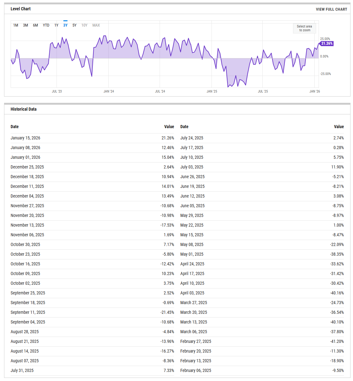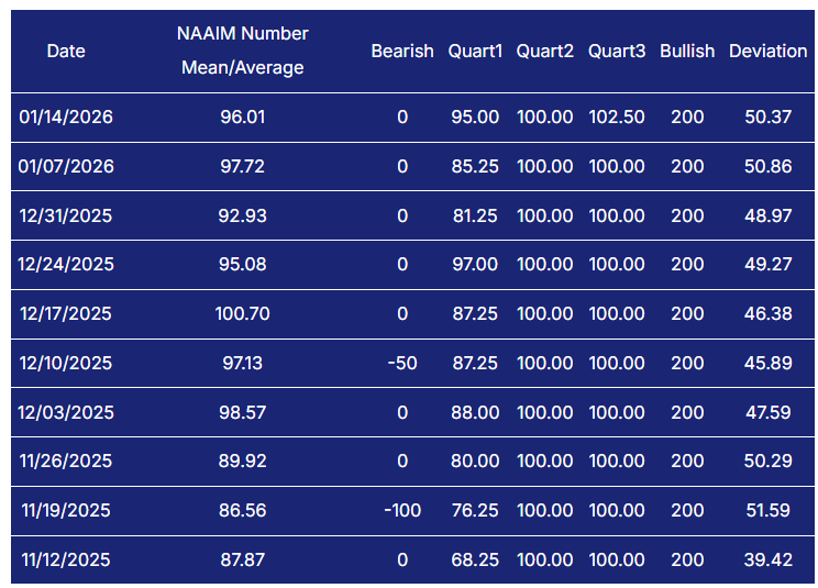 The NAAIM Exposure Index confirms that active managers are already heavily committed. The latest reading shown is 96.01 on January 14, following 97.72 on January 7 and 92.93 on December 31. That cluster near full exposure tells me there is very little dry powder left among this cohort. The bullish interpretation is that managers believe the path of least resistance is higher and are willing to stay involved. The cautionary interpretation is that when exposure is this high, incremental buying power is limited and downside can accelerate if price falters. What matters now is not the absolute level but the direction of travel. A pullback in exposure into the 50s without corresponding price damage would be constructive, as it would rebuild fuel for a later advance. A sharp exposure cut while prices are still near highs would be a more concerning signal that de-risking is leading the tape.