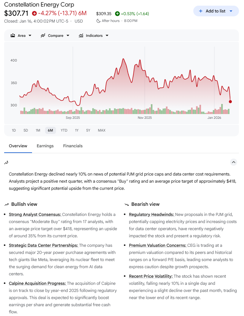 Another policy development emerged around energy infrastructure. The administration proposed that PJM, the country’s largest electrical grid operator, hold an emergency auction that would force technology companies without dedicated power production to cover the costs of new power infrastructure. Power equipment makers rallied on the news, while independent power producers sold off sharply. Constellation Energy (CEG), Vistra (VST), and Talen Energy (TLN) fell roughly 10% on the day, reflecting concerns that pricing could be hit. This followed Microsoft (MSFT) outlining plans to ensure its energy demands do not raise consumer electricity prices, a notable signal in a midterm election year.