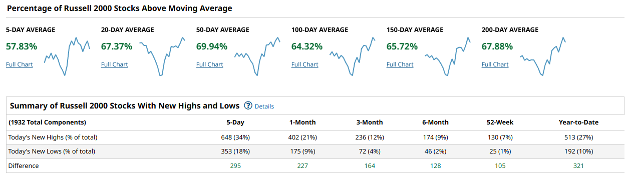 The Russell 2000 is the most bullish breadth read of the four, and it is not close. 57.83% of constituents are above the 5-day, 67.37% above the 20-day, and 69.94% above the 50-day. The longer-term cohorts are also strong with 64.32% above the 100-day, 65.72% above the 150-day, and 67.88% above the 200-day. The highs-minus-lows data is outright emphatic: +295 over 5 days (648 highs vs 353 lows), +227 over 1 month (402 vs 175), +164 over 3 months (236 vs 72), +128 over 6 months (174 vs 46), +105 on the 52-week window (130 vs 25), and +321 year-to-date (513 vs 192). That is what broad, durable participation looks like when risk appetite is real and not just concentrated in a few mega-caps.