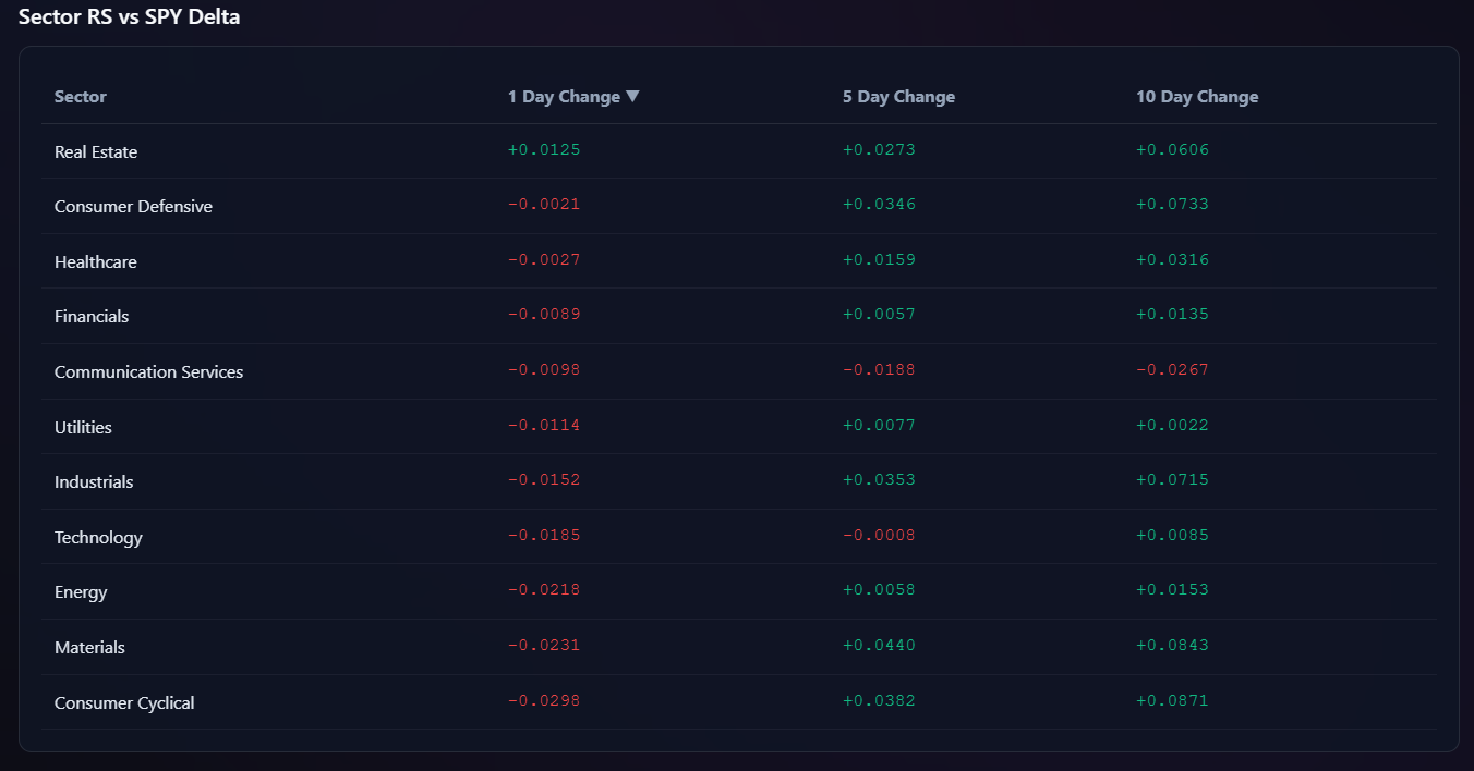 For day traders, this list is a powerful awareness tool. Sector Leaders tend to offer cleaner intraday structure, better follow-through, and more predictable reactions around key levels because they already sit on the right side of relative strength. Even on choppy tape, leadership names often remain tradeable while the rest of the market degrades.