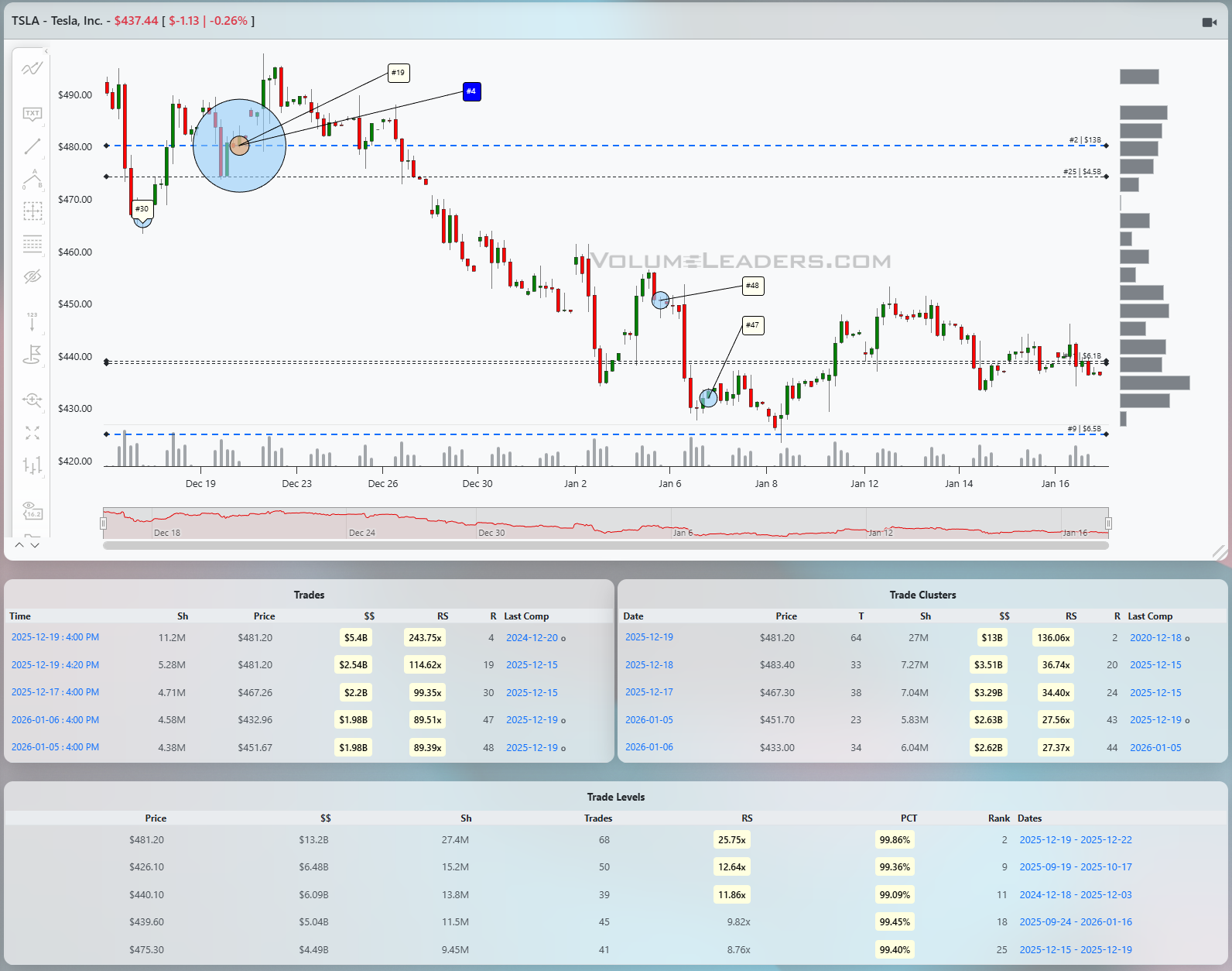 When you’re a large institutional player, your primary goal is to find liquidity - places to do a ton of business with the least amount of slippage possible. VolumeLeaders.com automatically identifies and visually plots the exact spots where institutions are doing business and where they are likely to return for more. It’s one of the primary reasons “support” and “resistance” concepts work and truly one of the reasons “price has memory”.