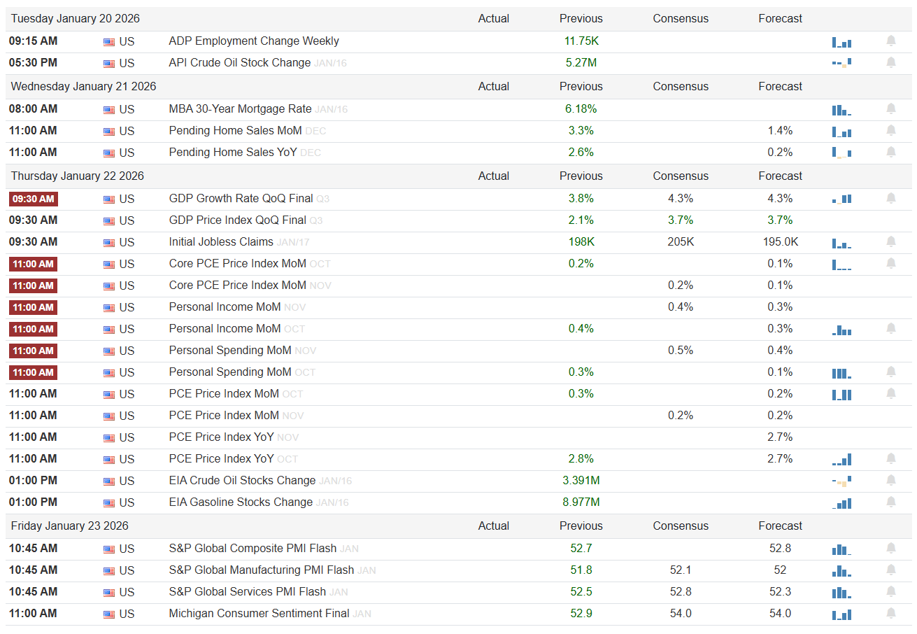 Wednesday brings housing into focus. MBA 30-year mortgage rates previously sat at 6.18%, still restrictive but no longer rising sharply. Pending Home Sales for December show a MoM forecast of 1.4% and a YoY forecast of 0.2%, while the prior YoY is shown at 2.6%. Upside here would reinforce the soft-landing narrative and support cyclicals. A miss would keep pressure on housing-sensitive equities and rate expectations. Earnings before the open include Johnson & Johnson, Charles Schwab, Prologis, Ally, Travelers, and Halliburton. Financials and industrials will be sensitive to commentary around credit demand, capex, and energy services activity.