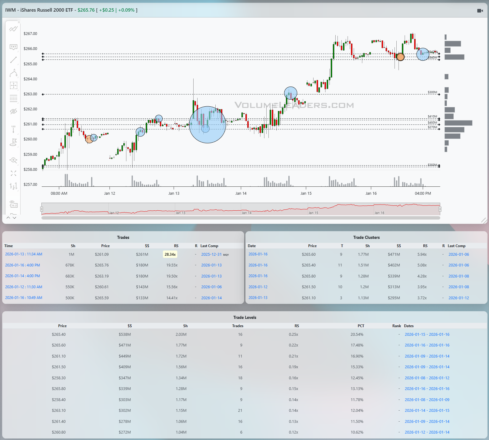 DIA sits somewhere between SPY and QQQ in tone. The selloff mid-week was sharp but brief, followed by a strong snapback that reclaimed prior balance. The key area here is the 491 to 492 zone, where a large cluster north of $450M with RS above 12x stands out. That level acted as both resistance and then support, classic role reversal behavior. Above it, price has struggled to sustain trade above the mid-494s, where multiple smaller clusters and prints suggest distribution rather than accumulation. Below, the next meaningful shelf sits closer to 489 to 490, which caught the bulk of the liquidation before buyers stepped in. Acceptance above 494 would signal that the Dow is ready to participate more fully in upside continuation. Failure back through 491 would shift focus to whether 489 can hold as responsive support.