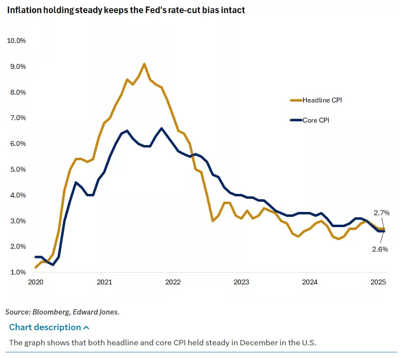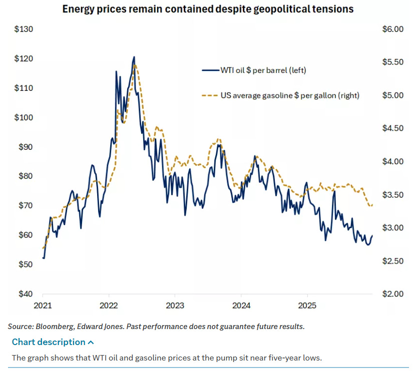 Despite all of this, markets have remained focused on fundamentals. Energy prices have been a key stabilizer. WTI crude sits near five-year lows around $60 per barrel, and U.S. gasoline prices hover near $3.35 per gallon. Even as geopolitical tensions flare, the International Energy Agency projects the global oil market will remain oversupplied in 2026, with rising OPEC+ output outpacing modest demand growth. That supply backdrop has helped cap energy-driven inflation risks.