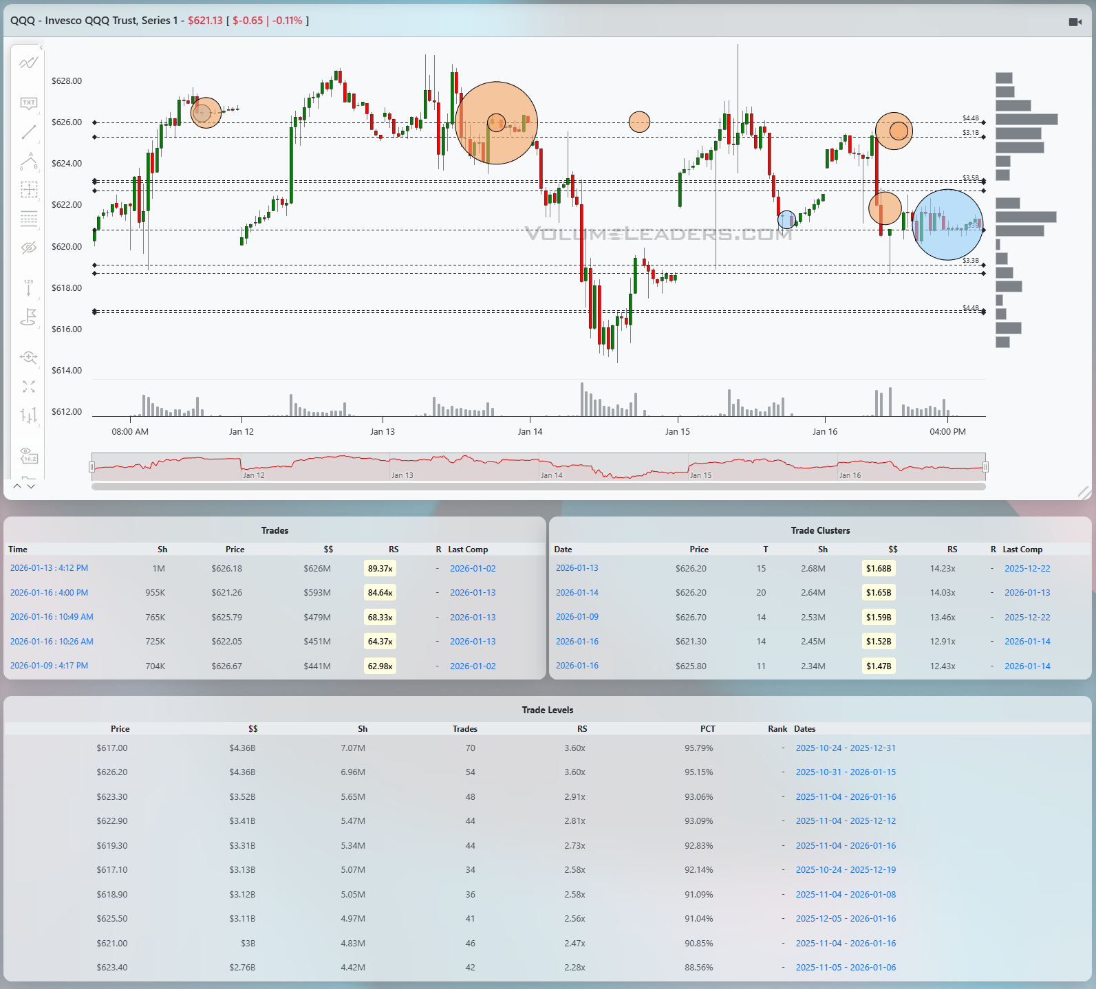 QQQ looks more fragile than SPY, both structurally and in the way size has behaved. The mid-week selloff was sharper, and the recovery has been choppier, carving out a lower, overlapping range. The dominant feature here is the heavy cluster of activity around 626 to 627. That zone shows multiple clusters in the $1.6B to $1.7B range with RS in the mid-teens, marking it as a key decision point. Large prints near 626 earlier in the week coincided with rejection rather than clean acceptance, and subsequent attempts higher stalled quickly. Below, the low 620s to high teens acted as a fast downside magnet during the liquidation, but price did not spend much time there, which hints at responsive buying rather than longer-term acceptance. For QQQ, the pass-fail is simple. Acceptance back above 626 to 627 would suggest the tape is repairing and could target the upper 620s again. Rejection there, followed by a loss of 622 to 621, would likely reopen the door to another test of the mid-teens lows.