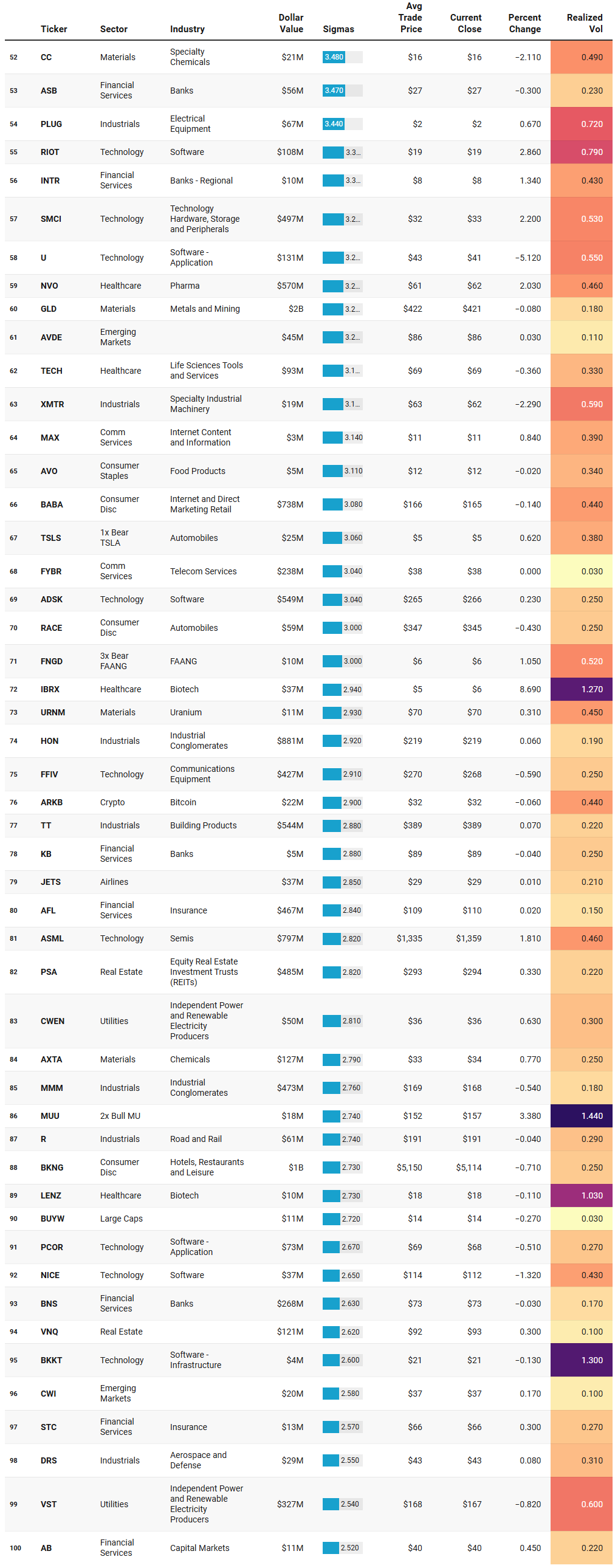 Institutional Outliers is a proprietary metric designed to spotlight trades that significantly exceed a stock’s recent institutional activity—specifically in terms of dollar volume. By comparing current trade size against each security's recent normalized history, the metric flags outlier events that may indicate sudden institutional interest but may be missed because the activity doesn’t raise any flags/alerts when comparing the activity against the ticker’s entire history. For example, it’s conceivable that a ticker today receives the largest trade it has had in the last 6 months but the trade is unranked and would therefore be missed by current alerts built off Trade Ranks. Day traders can use “Realized Vol” to identify tickers that are moving swiftly with large price displacement while others can use it to size your risk appropriately.