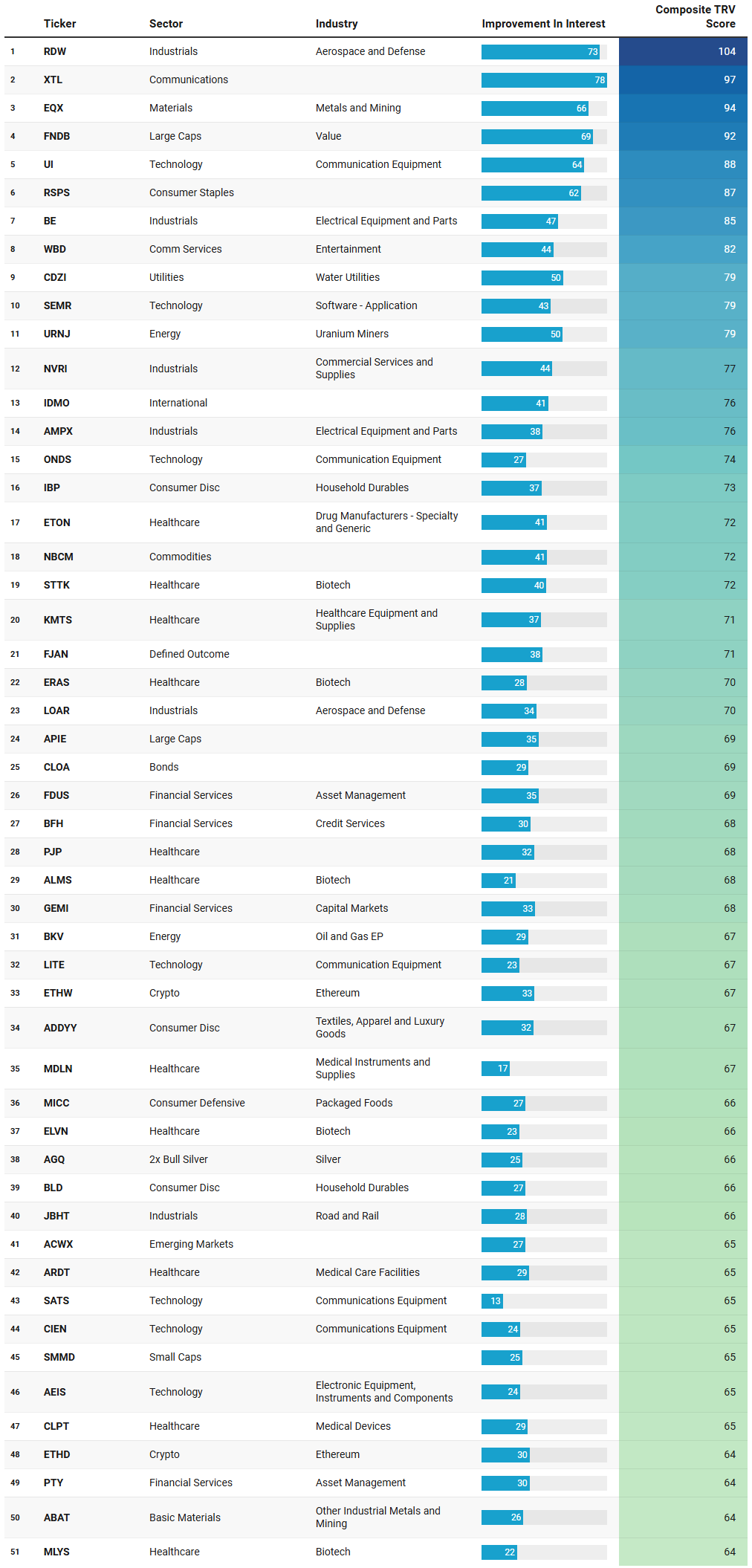 In sum, the TRV list reads like a blueprint for the current regime. Capital is flowing toward industrial capacity, real assets, infrastructure technology, and selective healthcare, while avoiding crowded growth narratives. It is a market defined by rotation, discrimination, and patience, where sustained interest matters more than sudden spikes, and where understanding why capital is flowing is far more important than simply knowing where it went.