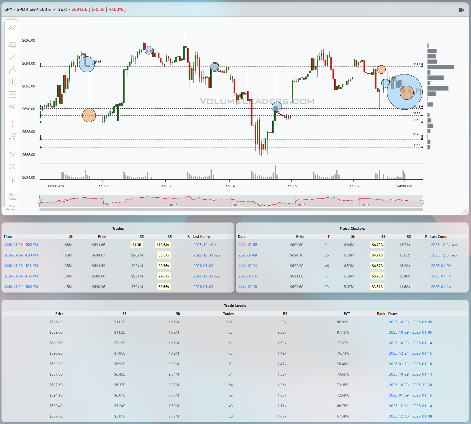 SPY has spent the last several sessions oscillating around a well-defined balance area rather than trending cleanly. The structure is impulse higher, sharp pullback mid-week, and then a recovery that stalls back into prior acceptance. The most obvious line of scrimmage is the 689 to 690 area. That zone stands out in the Levels table with roughly $11.3B at 686.80 and $11.2B at 689.00, both with RS north of 2.3x and PCT in the mid-to-high 80s. Those are not casual levels; they represent repeated agreement. Price dipped into the high 686s during the selloff and was immediately met with responsive buying, suggesting absorption rather than panic liquidation. On the upside, repeated attempts into the mid-694s have struggled. That area aligns with lighter but still meaningful Levels near 694 to 695 and multiple large individual prints that failed to extend. The presence of large blue and orange circles near the recent highs tells me size was active, but the lack of follow-through suggests more distribution than fresh initiative buying. Acceptance above the mid-694s would flip the tape back into continuation mode with the next magnet toward the upper 695s. Failure back below 689 opens the door to a deeper rotation toward the high 686s, where buyers have already shown their hand.
