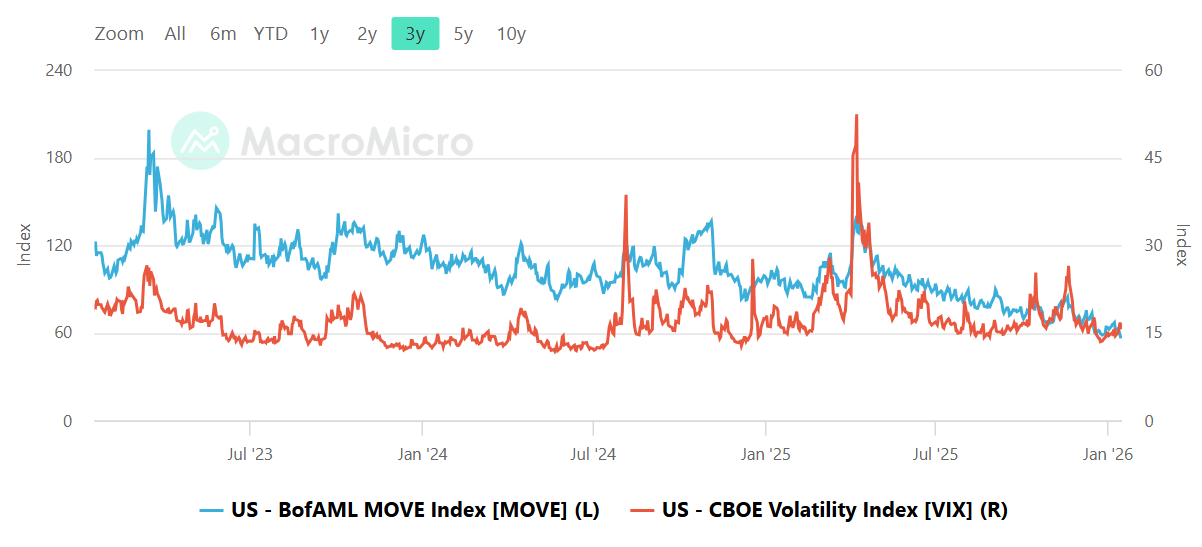 The MOVE versus VIX panel shows both bond and equity volatility subdued relative to their historical stress episodes. Exact end values are not readable, but the overall configuration is calm: rates volatility has been trending lower, and equity volatility remains contained. This combination is typically friendly to risk assets, as stable bond markets reduce the chance of sudden cross-asset shocks. The nuance is timing. Bond volatility often moves first, with equities responding later. That makes the relationship more important than the level. A renewed rise in MOVE while VIX stays sleepy would be an early warning that macro stress is brewing beneath the surface. A separate tripwire is VIX itself. A sustained push into the high teens would signal that realized calm is ending and that drawdowns may deepen rather than resolve quickly.
