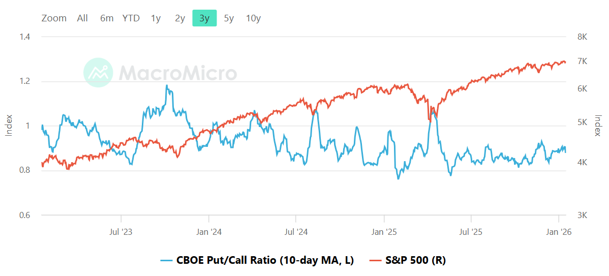 The chart shows the 10-day moving average of the total put/call ratio, but no precise numeric value is legible. Qualitatively, it sits below 1.0 and well under the fear spikes seen at prior stress points. That keeps the tone closer to complacent than defensive. When put/call runs low, it tells me hedging demand is muted and traders are not paying up for downside protection. This usually supports trend continuation but changes the character of pullbacks. Without a cushion of heavy hedging, declines can feel sharper and rebounds can be less explosive because there is less forced covering. The practical tripwires are behavioral. A rising 10-day average toward the 1.0 area would signal fear returning and would improve the odds that dips are bought more aggressively. Continued suppression while prices extend would increase the odds that any surprise shock produces a fast, uncomfortable drawdown.