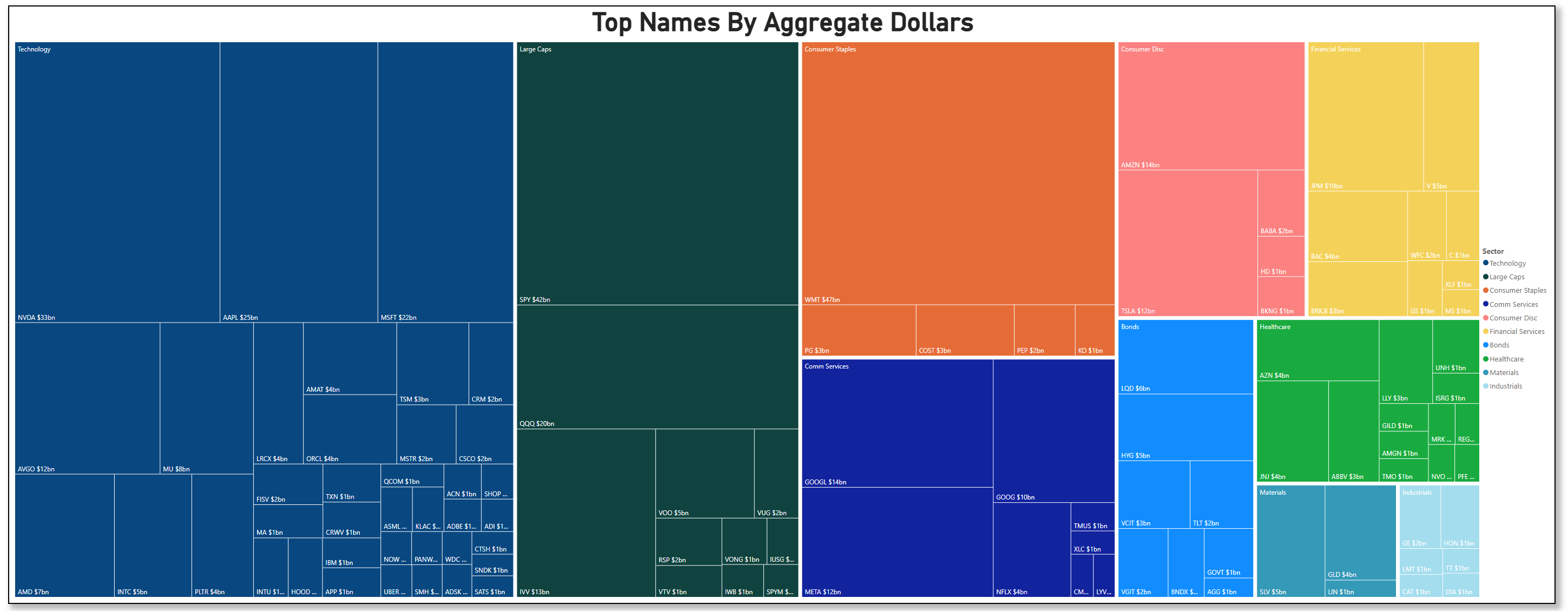 The most dominant signal is impossible to miss. Walmart sits completely alone at the top of the distribution, not merely as a large-cap staple, but as a liquidity event in its own right. The dollar value transacted in WMT overwhelms everything else on the list by an order of magnitude, and it did so with elevated sigma intensity and muted realized volatility. When capital chooses Walmart as its primary expression, it is making a statement about risk preference: safety, pricing power, and cash-flow durability over narrative growth.