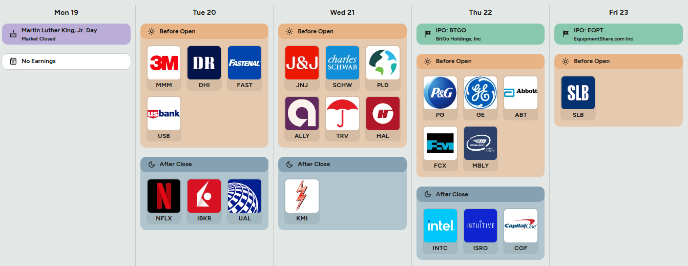 Monday is straightforward. Markets are closed for Martin Luther King Jr. Day and there are no earnings on the board. Liquidity will be thin globally, and the real setup work happens in futures positioning ahead of Tuesday’s data flow.