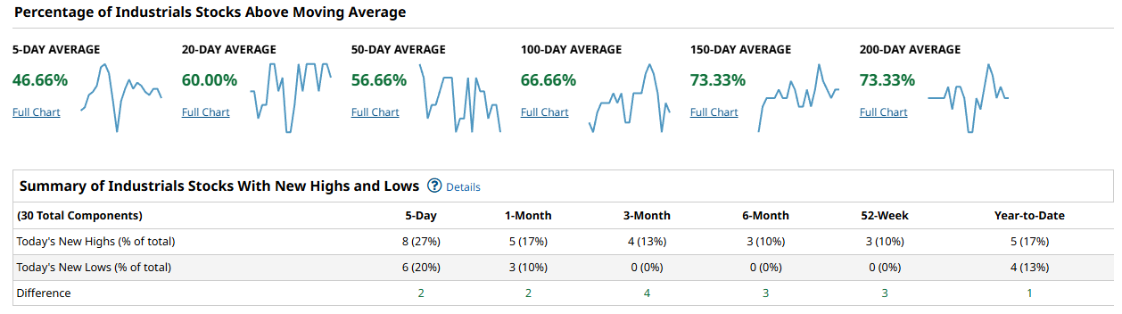 The Dow/Industrials snapshot looks more like a market that is digesting rather than breaking down. Short-term participation is softer with 46.66% above the 5-day, while 60.00% are above the 20-day and 56.66% above the 50-day. The longer-term measures are the encouraging part: 66.66% above the 100-day, and a notable 73.33% above both the 150-day and the 200-day. In other words, the primary trend is intact, but the short-term tape has cooled. New highs minus new lows is positive but small: +2 over 5 days (8 vs 6), +2 over 1 month (5 vs 3), +4 over 3 months (4 vs 0), +3 over 6 months (3 vs 0), +3 on the 52-week window (3 vs 0), and +1 year-to-date (5 vs 4). That reads like steady underlying health without a broad breakout impulse.