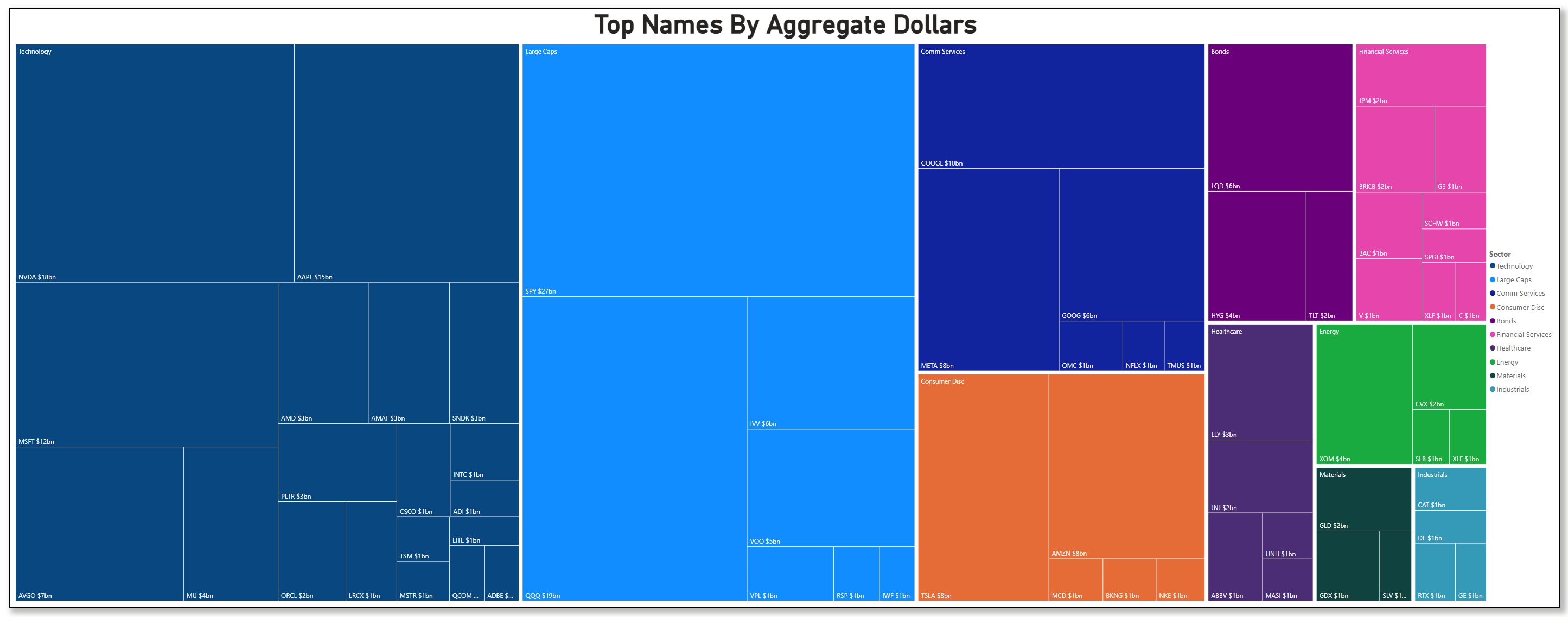 Drilling into names, the treemap of “Top Names by Aggregate Dollars” is dominated by technology and large caps. NVIDIA sits near $18 billion, Apple around $15 billion, Microsoft roughly $12 billion, and AVGO near $7 billion. A long tail of semis and platform names—AMD, AMAT, MU, ORCL, PLTR, QCOM, and others—cluster in the $1–4 billion zone. On the large‑cap side, SPY carries about $27 billion, IVV and VOO each sit around $5–6 billion, and QQQ near $9 billion. Communication services contributes GOOG at $10 billion and GOOGL at $6 billion, plus META at $8 billion and streaming names like NFLX and TMUS around $1 billion apiece. In bonds and credit, LQD and HYG both show roughly $6 billion, matched by TLT at about $2 billion. Financials feature JPM and BRK.B around $2 billion, BAC and GS near $1 billion, and XLF itself at $1 billion. Energy is led by CVX at $2 billion, with services and integrated names like SLB and XLE at about $1 billion each. The picture is not one of retreat; it is one of deliberate concentration in the names and products that dominate index weightings and drive factor exposures.
