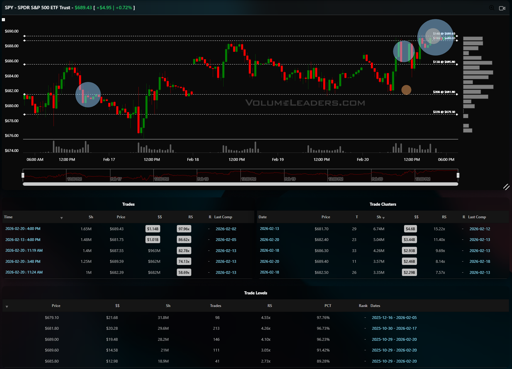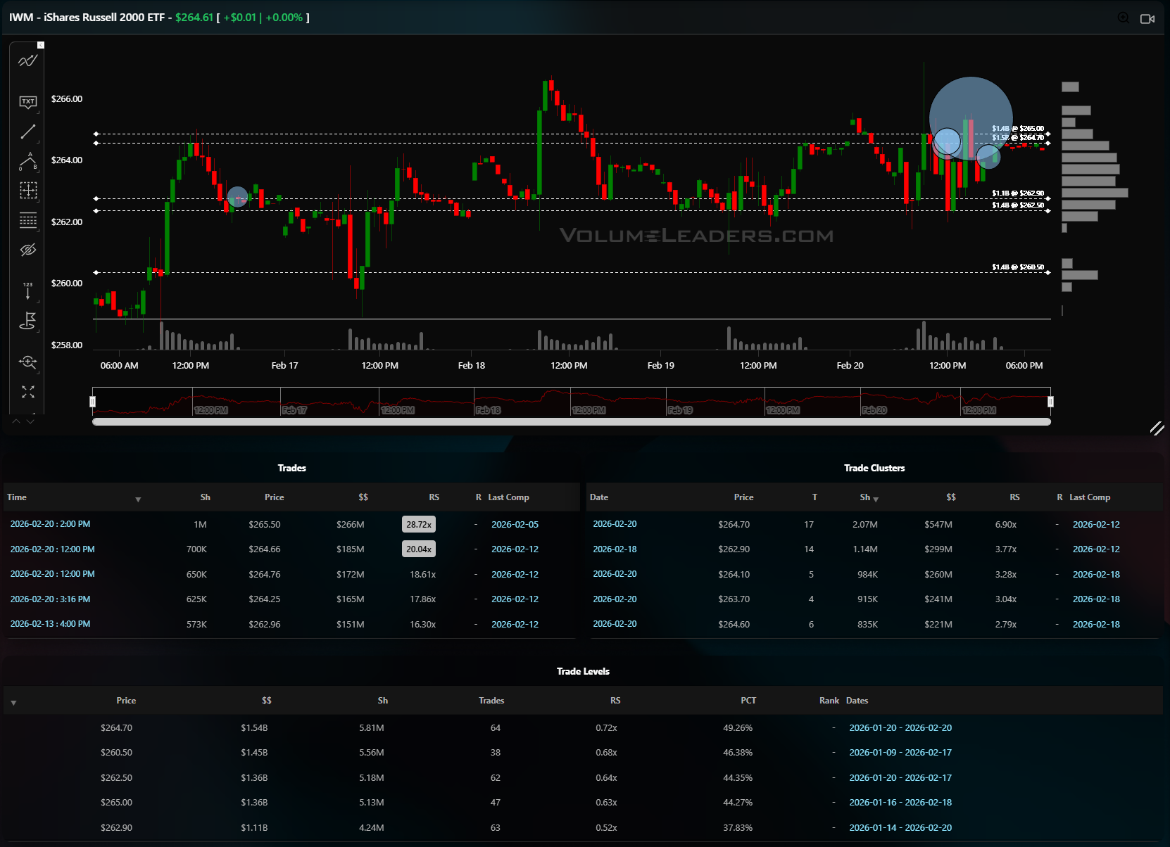 IWM’s tape is more range‑bound but the tape shows meaningful accumulation in the mid‑260s. On February 20, a 1M‑share block went off at about 264.70 for $266M, RS nearly 29x, followed by a 700k block at 264.65 for $185M with RS over 20x. Both sit right in a band where cumulative Levels show more than $1.1–1.5B traded between roughly 260.5 and 264.7, but with RS only around 0.5–0.7x and PCT in the 40–50% zone. That mix says historic Level volume is moderate, but recent “who done it” size is aggressive, suggesting fresh positioning rather than just churn. The pass/fail area is essentially 262–265. Hold above that and you can argue small caps are being quietly accumulated with a magnet back toward the recent spike high; break below 262 with those big prints trapped and the risk shifts to a fast move back into the high 250s where the next trade Levels sit. Traders can anchor risk to that 262–265 band, buying higher lows above it with tight invalidation or selling breakdowns through it for a quick mean‑reversion move.