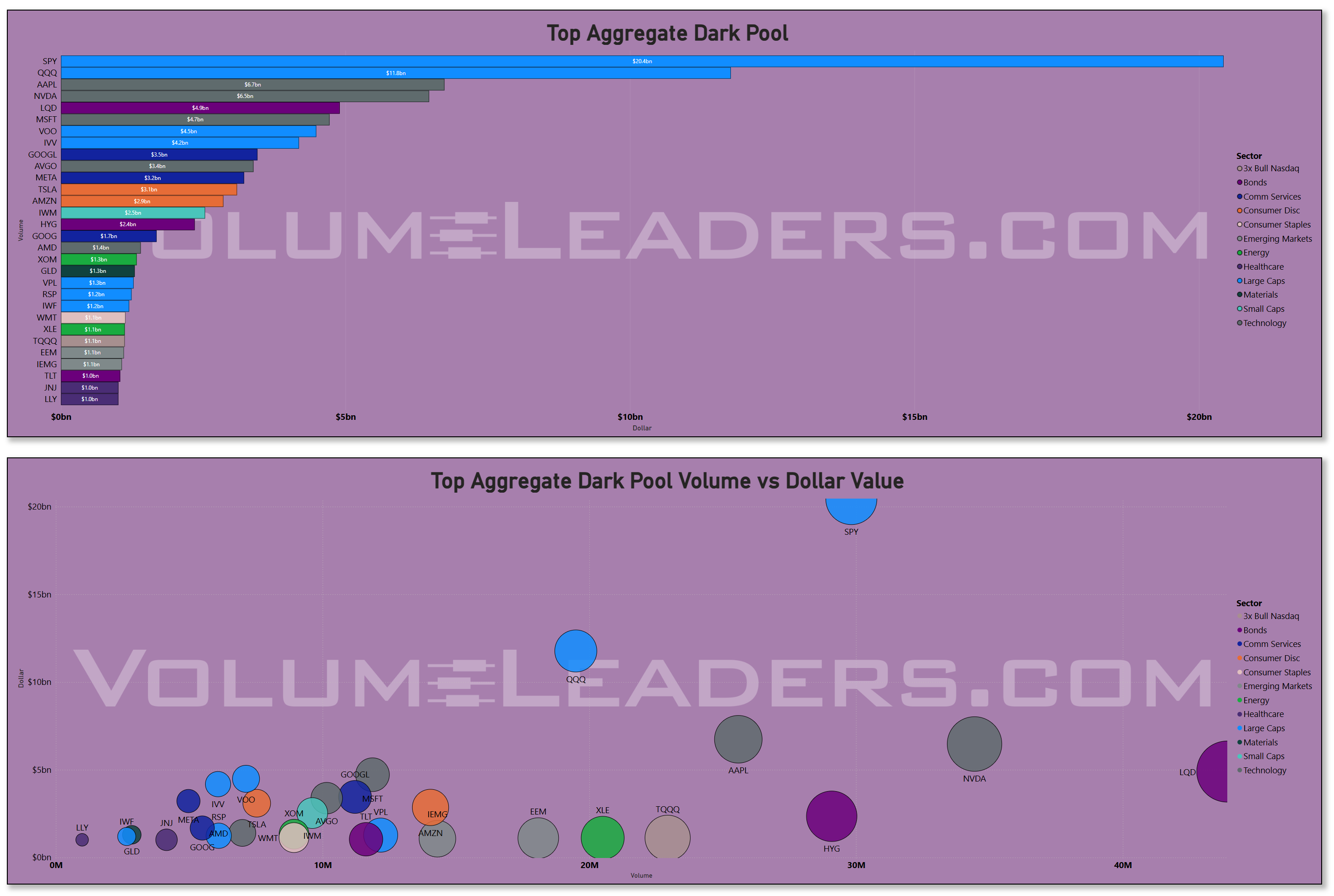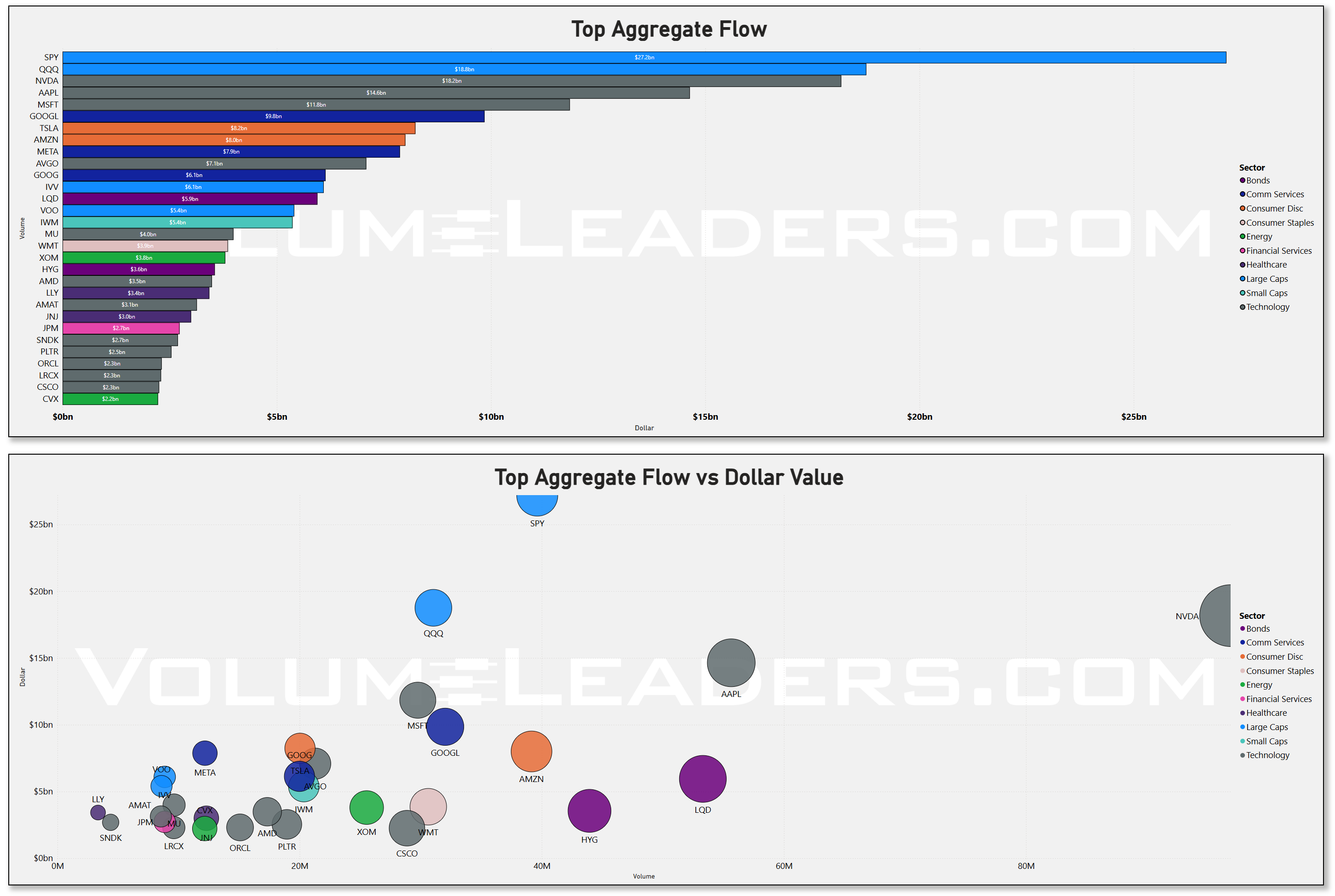When you aggregate all trade types across lit and dark venues, the hierarchy tightens. SPY tops the list at roughly $27 billion in weekly flow, followed by QQQ in the low‑teens, then NVIDIA, Apple, and Microsoft in the $10–13 billion area. Tesla, Amazon, and META run in the $7–9 billion range, while GOOG, TSLA, AMZN, and sector ETFs like XLV, IWM, and XOM sit a tier lower at $3–6 billion. On the scatter of volume versus dollars, SPY stands alone as both the highest‑volume and highest‑notional print, QQQ and NVIDIA cluster beneath it, and Apple appears as a giant notional bubble with somewhat less share turnover, reflecting its higher price. This is broad positioning, not just tactical punts: institutions are using the deepest, most liquid vehicles to express a view that is still net long but more balanced between growth and defense than it was a few months ago.