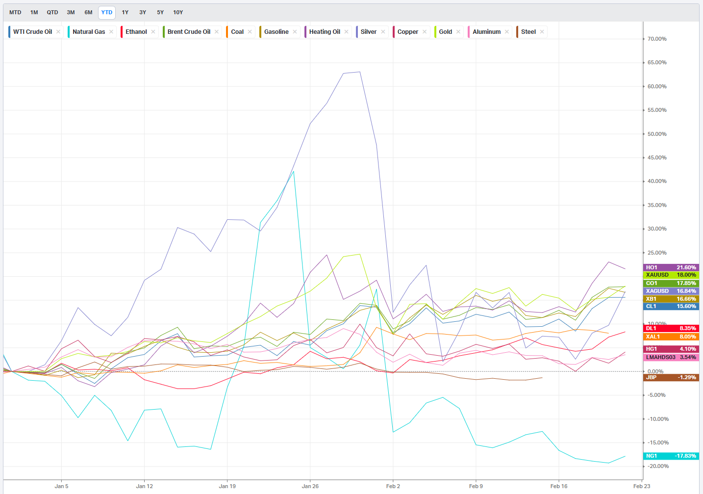 Commodities wrapped the week with a distinctly risk‑on flavor. Brent crude finished around $71–72 a barrel, up roughly 6% on the week, helped by rising tensions between the U.S. and Iran and a surprisingly large 9‑million‑barrel crude inventory draw. Natural gas, by contrast, gave back more of its winter‑storm spike as weather patterns turned milder. Precious metals were quiet until the back half of the week, then rallied; gold is trying to hold above the $5,100 level, while silver and copper both reclaimed their 50‑day moving averages. Agriculture caught a bid after the USDA raised price outlooks on lower planted acreage, with wheat leading on expectations of reduced production. Crypto quietly drifted lower, with Bitcoin stuck in a tightening range below the highs, capped repeatedly by an 8‑day moving average that traders have clearly been watching.