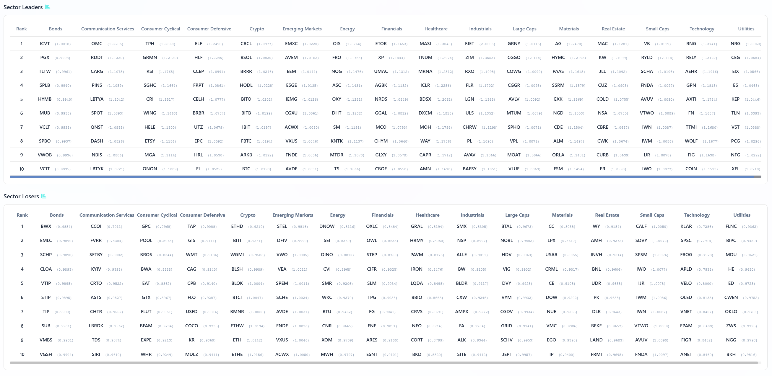 The sector leaders and losers board adds some nice texture to what we have already seen in the flows and TRV lists. At a high level, leadership is coming from quality within each group rather than from speculative edges, and the laggards are disproportionately the story‑heavy, balance‑sheet‑lighter names.