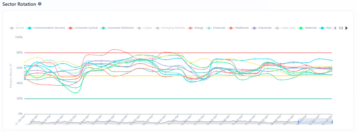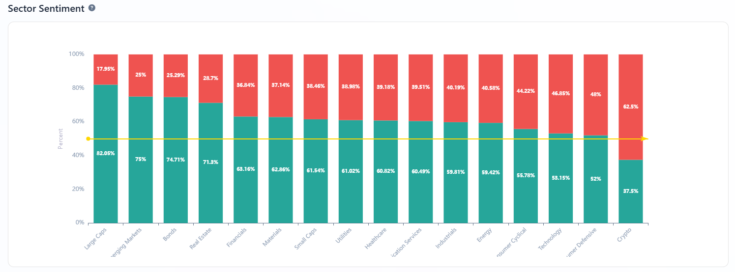 You can think of this week’s tape as “selective risk‑on”: the composite read is bullish, but the market is choosy about where it wants to express that optimism. Overall sentiment is running about 62% bullish versus 38% bearish, and a number of sectors are sitting comfortably north of the 60 line, while several others are hovering close to 50 rather than deeply negative. That is not a risk‑off regime; it is a market that still wants exposure, but increasingly prefers size, quality, and certain macro narratives over blanket beta.