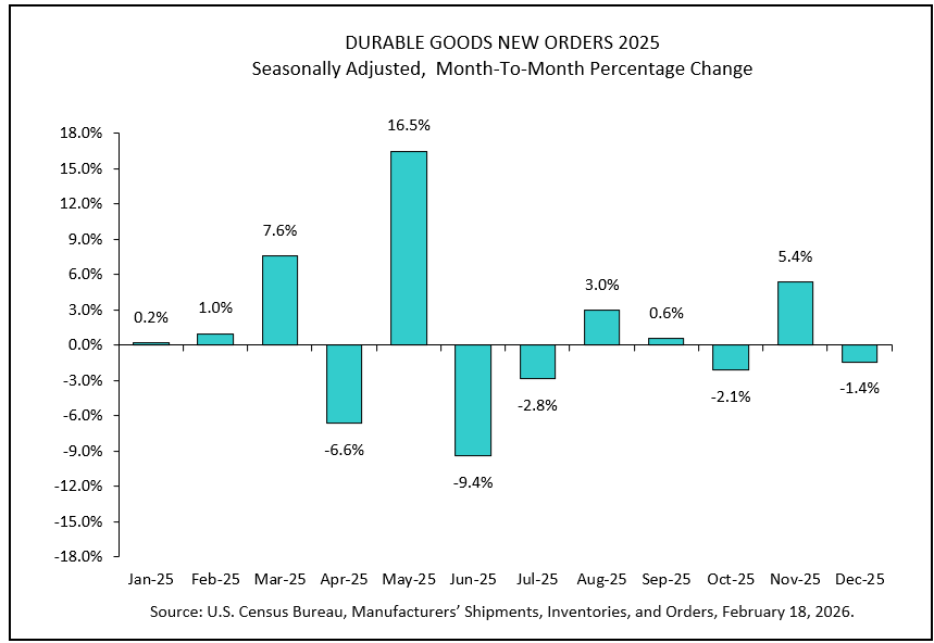 On the macro front, last week’s data confirmed what most of us already suspected: the U.S. economy has downshifted from the blistering 4.4% annualized growth of the third quarter to a more sustainable pace, but it has not fallen off a cliff. Fourth‑quarter GDP printed at 1.4% annualized, with most of the drag coming from government spending and exports. Consumer spending contributed about 1.6 percentage points of growth, down from Q3 but still solid. Business investment added roughly 0.7 points, helped by an uptick in residential spending. Industrial production and capacity utilization improved, and while durable goods orders for December fell 1.4% month‑over‑month, that came after a huge 5.4% gain the prior month. Core capital goods orders—which better capture business equipment spending—actually rose 0.6%, beating expectations.