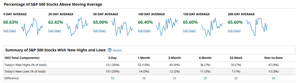 In the S&P 500, participation is impressively broad. About 60.6% of names are above the 5‑day, 62.4% above the 20‑day, 65.0% above the 50‑day, 66.4% above the 100‑day, and 65.6% above both the 150‑ and 200‑day moving averages. Today’s new highs tally 151 stocks, or 30% of the index, versus 101 new lows, or 20%, for a 5‑day net of +50. On a 1‑month basis, new highs beat new lows 52 to 14, for a net of +38; at 3 months the spread is 45 to 12, net +33; and at 6 months 36 to 11, net +25. Even over the 52‑week window, new highs are 33 versus just 7 new lows, a net of +26, and year‑to‑date stands at 47 highs against 13 lows, net +34. That is the profile of an index where the uptrend is not only intact but engaging most of the roster.
