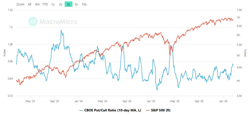 The 10-day moving average of the CBOE total put/call ratio is hovering close to the middle of its three-year range, oscillating around the 0.90–0.95 area after having dipped toward 0.80 at prior points of optimism and spiked above 1.10 during stress episodes. Right now it is neither signaling outright complacency nor panic, which fits a market that has pulled back modestly but not yet forced traders into capitulation. In practice, that means options positioning is not providing a big contrarian edge this week: there is enough put buying to limit the odds of an air-pocket drop, but not enough fear to guarantee a powerful squeeze higher. If this 10-day average rolls back toward 0.80 while prices grind up, that would mark a frothier setup where pullbacks tend to be sharper. Conversely, a push above 1.05–1.10 on a market wobble would signal more durable downside protection has been bought, often laying the groundwork for a better-quality rally.