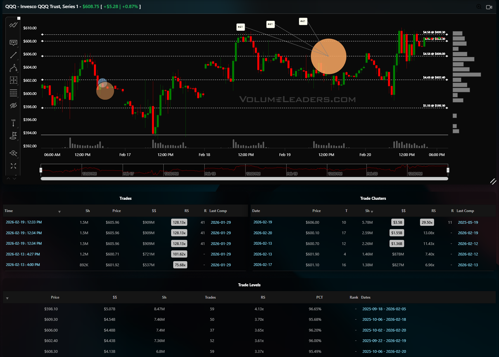 QQQ shows a similar pattern but with even more concentrated size near the highs. The standout sequence is a run of prints around 605–606 that each traded about 1.5M shares and roughly $900M notional, with RS metrics in the 100–128x area, tagged as top‑100 historical trades. That kind of clustering after a push off the lows almost always marks a battleground between funds re‑loading long and others taking liquidity. The trade Levels table shows massive all‑time volume around 606–609, with $$ north of $4–5B, RS above 3.5x and PCT in the mid‑90s. Acceptance above that 606–609 band turns it into a launchpad with a natural magnet toward the prior high zone just above, while rejection and repeated failure there would confirm it as supply. For execution, the clean long is buying pullbacks that hold above roughly 598–600, where another thick Level lives, with first targets back into 606–609; the clean short is fading spikes into that same 606–609 band with stops just above and eyes on a rotation back to 598 and then the low 590s if the floor gives way.