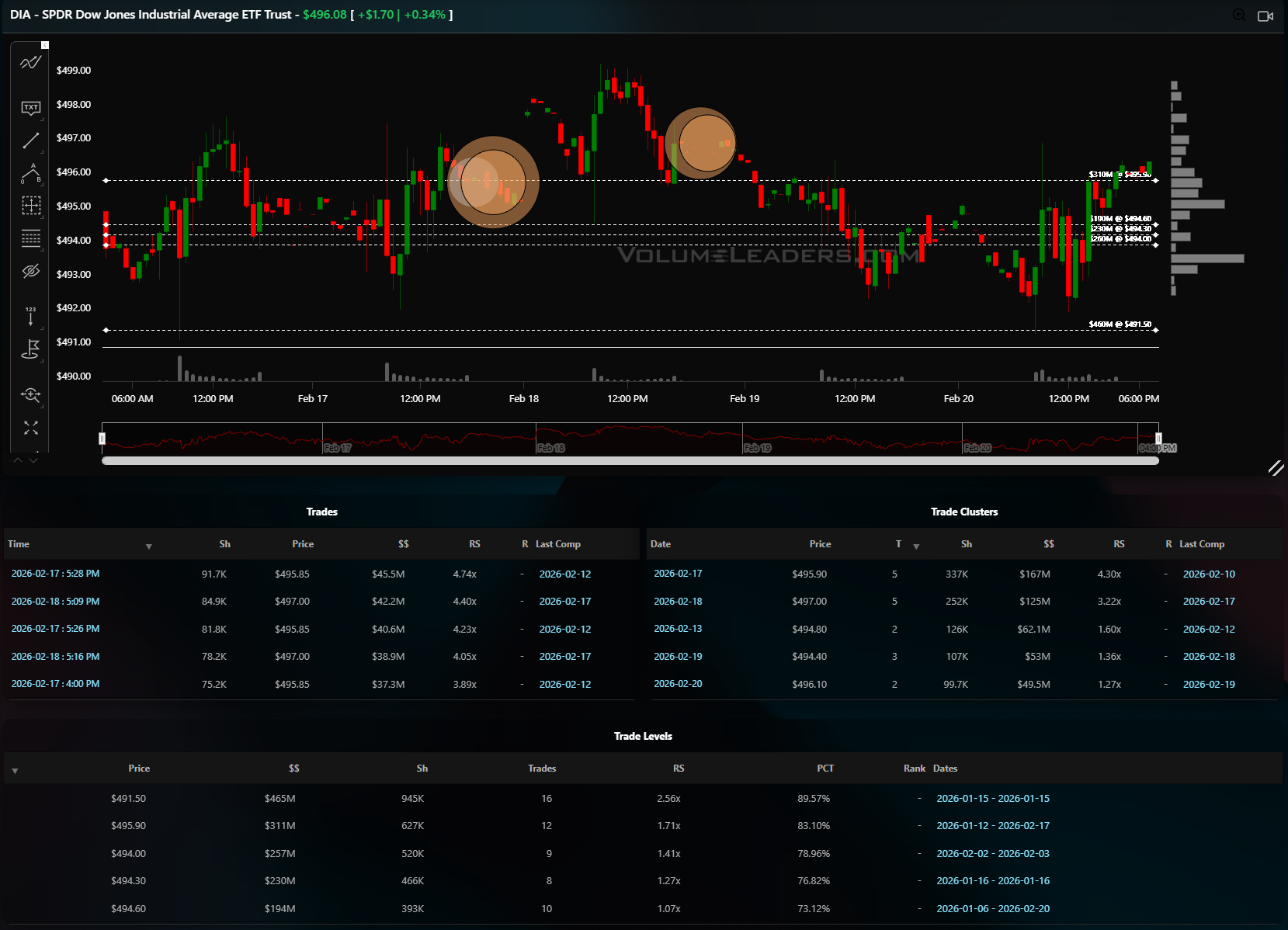DIA has put in a broad sideways range with attempts to push higher repeatedly meeting size near the mid‑495s. The recent trade list shows blocks around 495–497 with 75–90k shares each and notional in the high $30–45M range, while the trade Levels table highlights a major Level near 491.5 that has done about $465M in volume, RS 2.56x and PCT close to 90%. That 491–492 shelf is the anchor for buyers; as long as price respects it, the path of least resistance is a grind back toward the upper band in the high 495s, where another $300M+ Level sits with RS north of 1.7x and PCT in the 80s. A decisive daily close below 491 would say that support finally failed and open room toward the lower 480s where older volume pockets lurk. A disciplined trader in DIA can frame longs against 491–492 with first targets into 495–497, while shorts look to fade stalling price action in that upper band with risk just above and an eye on a rotation back into the 491 shelf.