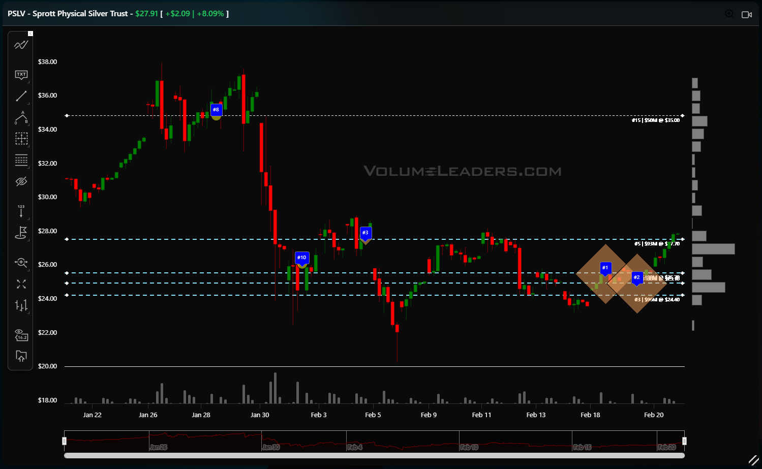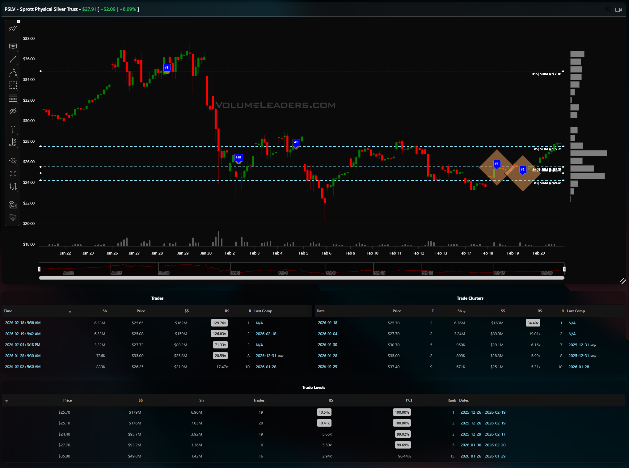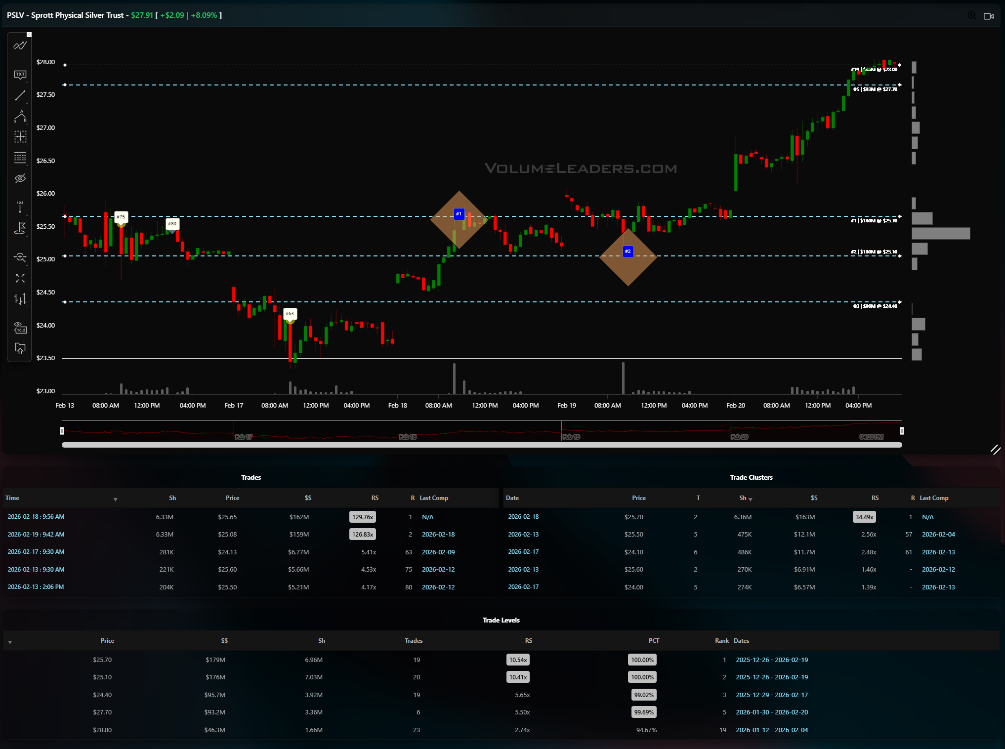 Start with the backdrop. After the late‑January flush from the mid‑$34s into the low‑$20s, price spent several sessions grinding sideways between roughly $24 and $26, building out a fat, horizontal volume profile. The Trade Levels table shows three dominant liquidity shelves in that zone: the largest at $25.70 with about $179M traded and an RS north of 10x, a second at $25.10 with around $174M and similar RS, and a third at $24.40 with just under $96M. All three are ranked at or near the 100th percentile of historical dollar volume. What that tells you is simple: this is where big money did business on the way down and then again during the basing process. If PSLV is going to turn, it almost has to turn from this band.