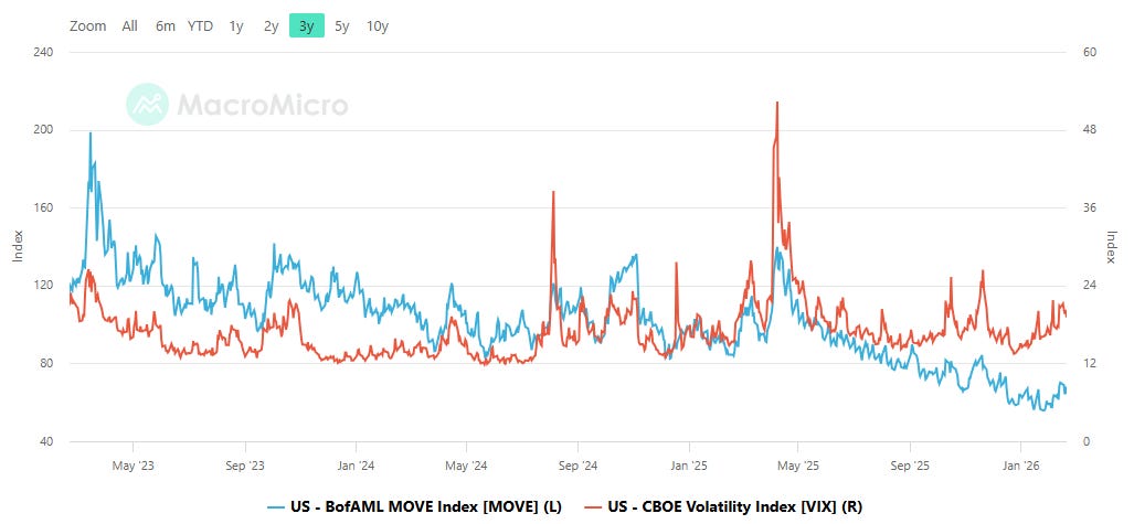 Across the MOVE and VIX pair, the picture is of gradually calming bond markets and still-contained but jumpy equity volatility. Over the past three years the MOVE index has bled steadily lower from the 150–200 zone into the high double digits, while the VIX has oscillated mostly between the low teens and low 20s with a few sharp spikes toward 30–40 during shock events. Recently, MOVE has drifted down toward the lower end of its range while VIX trades in the mid-teens to high-teens area, suggesting rates volatility is no longer the primary source of systemic stress and that equity vol is responding more to idiosyncratic and earnings-related noise. For risk-taking, that mix is supportive: when both vol complexes are subdued, carry and dip-buying strategies tend to work. The tripwires would be a renewed MOVE surge back above roughly 120 while VIX is still sleepy, which often front-runs equity trouble, or a VIX breakout into the low 20s or higher even with a tame MOVE, which would flag equity-specific risk aversion that deserves respect.