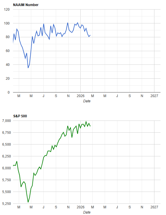 Active managers remain heavily invested. The latest NAAIM Exposure Index prints 82.87, following 80.61 and 84.93 in the two prior weeks, after sitting in the 90–100 zone for much of December and early January. There are effectively no bearish outliers on the panel, with the bearish column at 0 or -200 in recent weeks, and the upper quartiles still clustered near 100, which confirms that most managers entered February close to fully invested rather than holding much dry powder. That means the tape has less “new buying” fuel available if prices rip higher, but also that any real risk-off episode could turn into forced de-risking because there is plenty of exposure to cut. A decisive roll of the NAAIM index down into the 50s or below, especially if the S&P is still near highs, would be an early warning that professionals are quietly heading for the exits; a renewed push back into the 90s would say they are embracing risk again and leaving very little cushion if volatility returns.