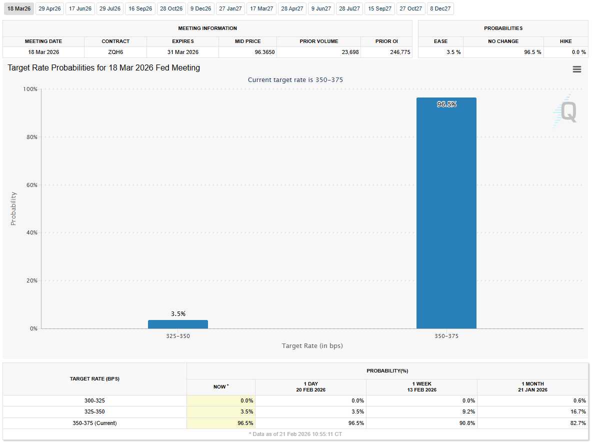 The Fed’s January minutes layered nuance on top of that data. Policymakers are nowhere near declaring victory on inflation. While they acknowledged reduced downside risks to employment, they emphasized that the risk of more persistent inflation remains. Some participants are now openly discussing the “possibility that upward adjustments” to rates could be appropriate if inflation re‑accelerates, even as others argue that further easing may be warranted if the data cooperates. Futures markets have responded by pulling forward the odds of “no change” in mid‑year meetings; the probability of a June hold is now approaching 50%, up meaningfully from last week. The message for equity investors is straightforward: rate cuts are coming later and more slowly than the market hoped back in December, but cuts are still on the table.