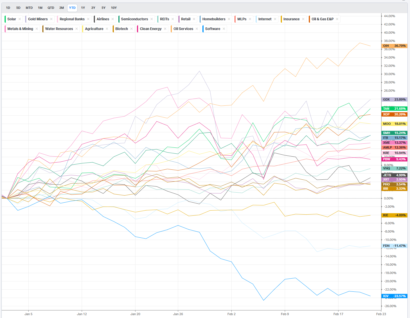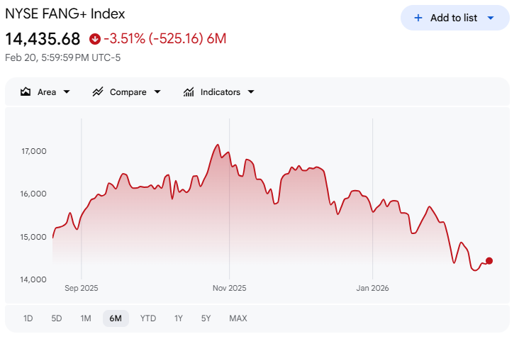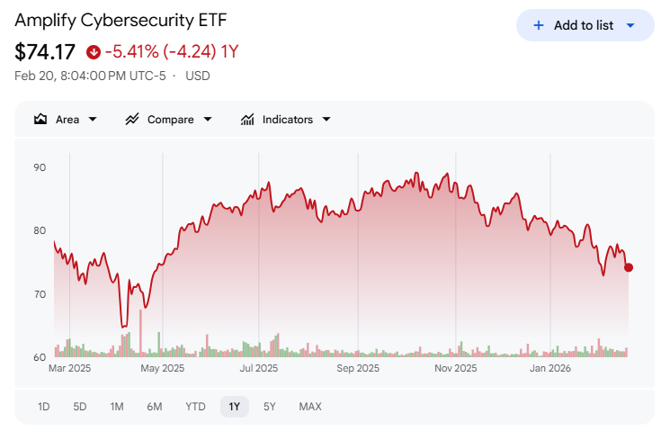 Back at the sector level in the U.S., the “AI winter” theme that had been hammering software and related areas started to show cracks. Some of the most heavily shorted names in software, analytics, staffing, and logistics bounced on better‑than‑feared earnings and dip‑buying. But the thaw is uneven. Cybersecurity stocks, which many had argued were insulated from AI disruption, sold off sharply after a major AI player launched an automated code‑scanning and security product. The cyber ETF HACK dropped roughly 3% on the day and nearly 5% on the week. That kind of dispersion is typical when a new technology narrative moves from pure hope to actual revenue and cost‑pressure realities: some business models get validated, others get challenged, and the blanket “own anything AI‑adjacent” trade stops working.