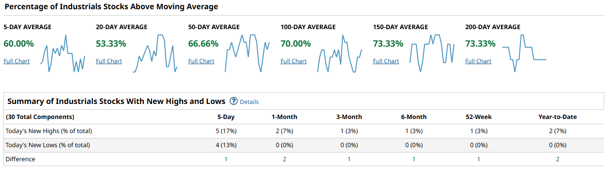 The Dow Industrials quietly sport one of the cleanest internal tapes of the group. Sixty percent of components are above the 5‑day, 53.3% above the 20‑day, 66.7% above the 50‑day, and a stout 70.0%, 73.3%, and 73.3% above the 100‑, 150‑, and 200‑day moving averages, respectively. On a 5‑day view, there are 5 new highs (17%) against 4 new lows (13%), for a net of +1. The 1‑month period shows 2 highs and 0 lows, net +2; 3 months 1 and 0, net +1; 6 months 1 and 0, net +1; 52‑weeks 1 and 0, net +1; and year‑to‑date 2 and 0, net +2. That pattern – more than two‑thirds of components above the intermediate and long‑term averages and almost no new lows on any horizon – is classic strong‑trend behavior.