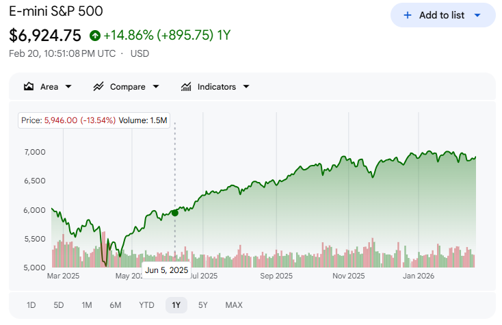 The E‑mini S&P 500 March 2026 contract (ESH26) told the same story in slightly different language. The contract settled near 6,923, up roughly 0.7% on the day, and its performance tables show a market that has been quietly grinding for months. Over the past three months, ESH26 is up about 4.7%, with a 52‑week gain north of 8% and a 1‑year low down in the 4,900s.