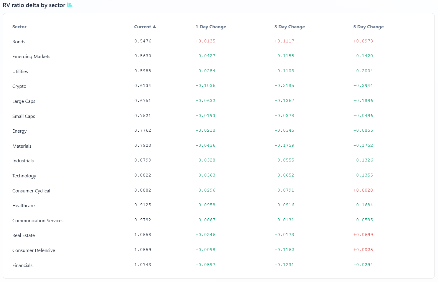 Under the hood, realized volatility and relative strength help explain why certain pockets are getting the nod. On the volatility side, most sectors are sitting near or a bit above “1” on the risk ratio, which means upside and downside swings are roughly balanced, but the direction of travel matters. Materials, emerging markets, real estate, and communication services show improving volatility profiles over the last five days, with up moves starting to outpace down moves, while technology, small caps, energy, and healthcare show deteriorating profiles as downside swings pick up. That tilt makes materials, real estate, and comms feel more “stable to trade,” while growthier areas feel jumpier and less forgiving.
