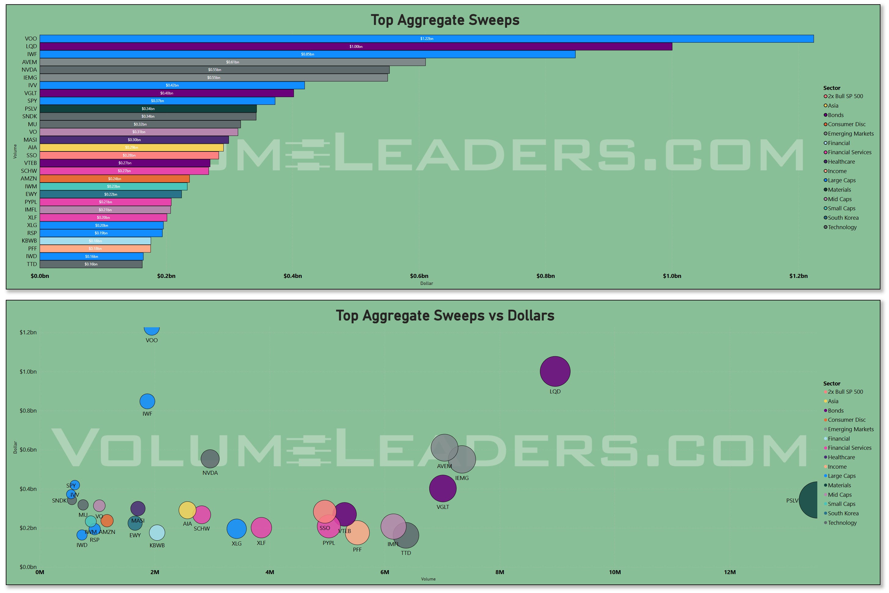 Sweep activity tells you where urgency is highest. The top‑sweeps bar chart shows VOO with well over $1.1 billion of sweeps, LQD and a leveraged S&P product in the $800–900 million zone, and AVEM, IEMG, and VGLT between $400 and $700 million. Individual tech names like NVIDIA, MU, and SNDK appear further down with $200–300 million. On the volume‑versus‑dollars scatter, LQD stands out as a high‑volume, high‑notional bubble, while VOO, SSO, and other broad beta products sit just behind it. That pattern says the fastest money is actively toggling index beta and credit exposure rather than frantically chasing or shorting single‑name growth. Given that recent data have pushed back the expected timing of Fed easing and kept two‑way risk alive in rates, it is logical to see sweeps concentrated in bond and index wrappers that let you adjust macro exposure quickly.