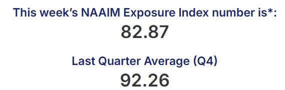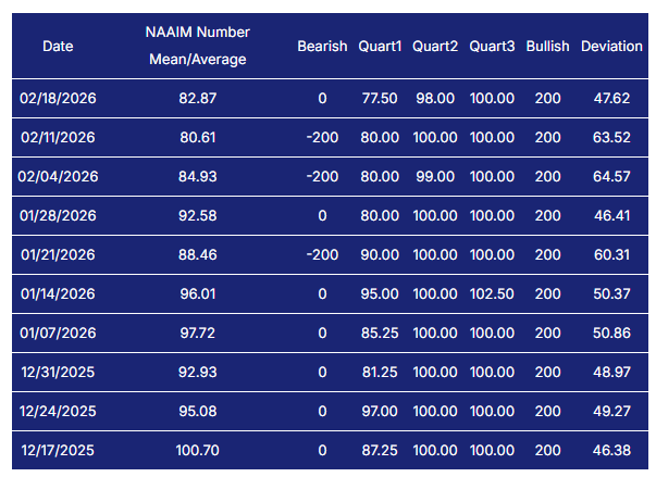 The NAAIM Exposure Index (National Association of Active Investment Managers Exposure Index) measures the average exposure to U.S. equity markets as reported by its member firms. These are typically active money managers who provide their equity exposure levels weekly. The index offers insight into how much these managers are investing in equities at any given time, ranging from being fully short (-100%) to leveraged long (up to +200%).