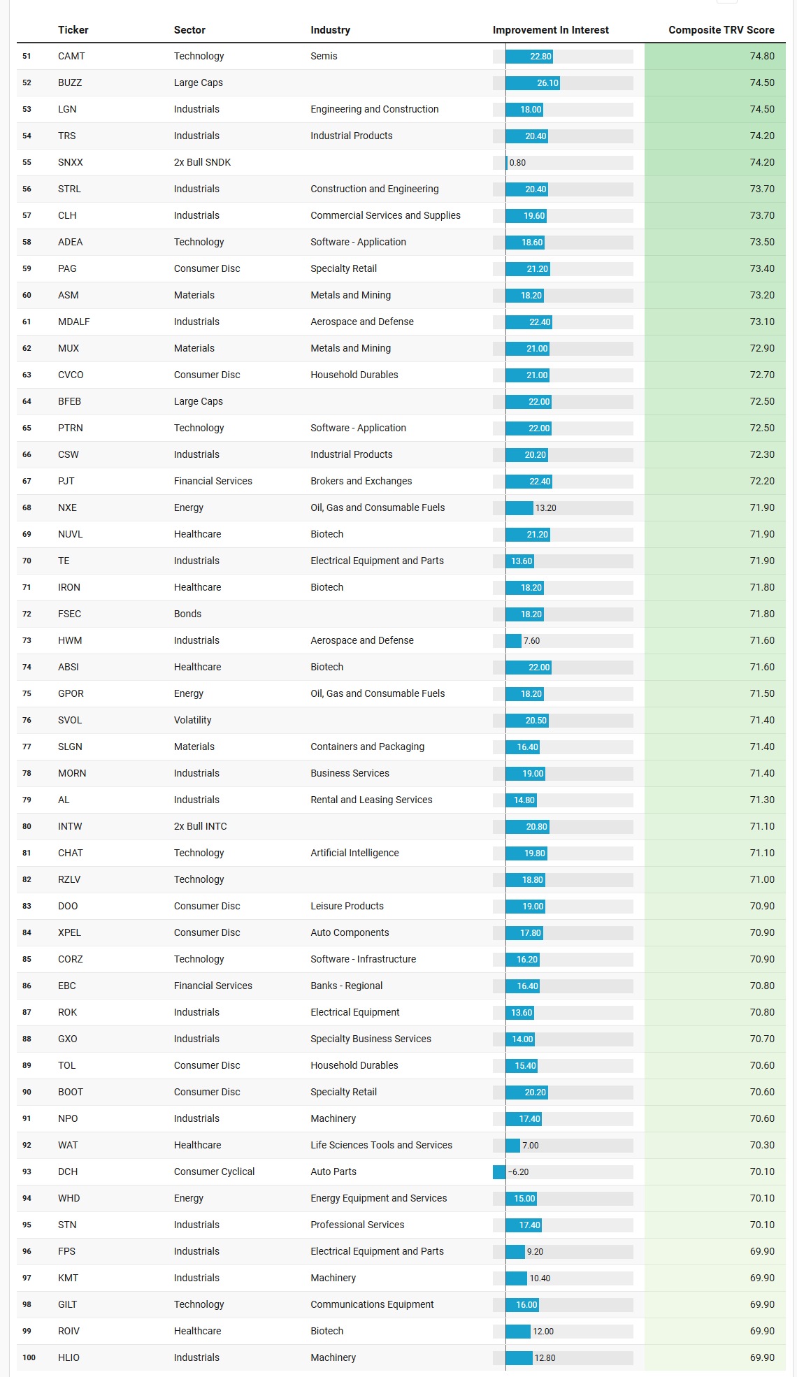 TRV is a proprietary metric that measures the recent acceleration or deceleration in institutional trading activity for a given stock by comparing its average trade rank over the past few days to its average in recent weeks. A sharp improvement in TRV typically reflects a notable shift in positioning, often accompanied by sustained trade activity, suggesting institutions are actively engaging with the name and that intensity of activity is rising. This often precludes meaningful price or narrative shifts. This isn’t a buy-list or sell-list; it’s meant to draw your eyes to names where institutions are putting money to work.