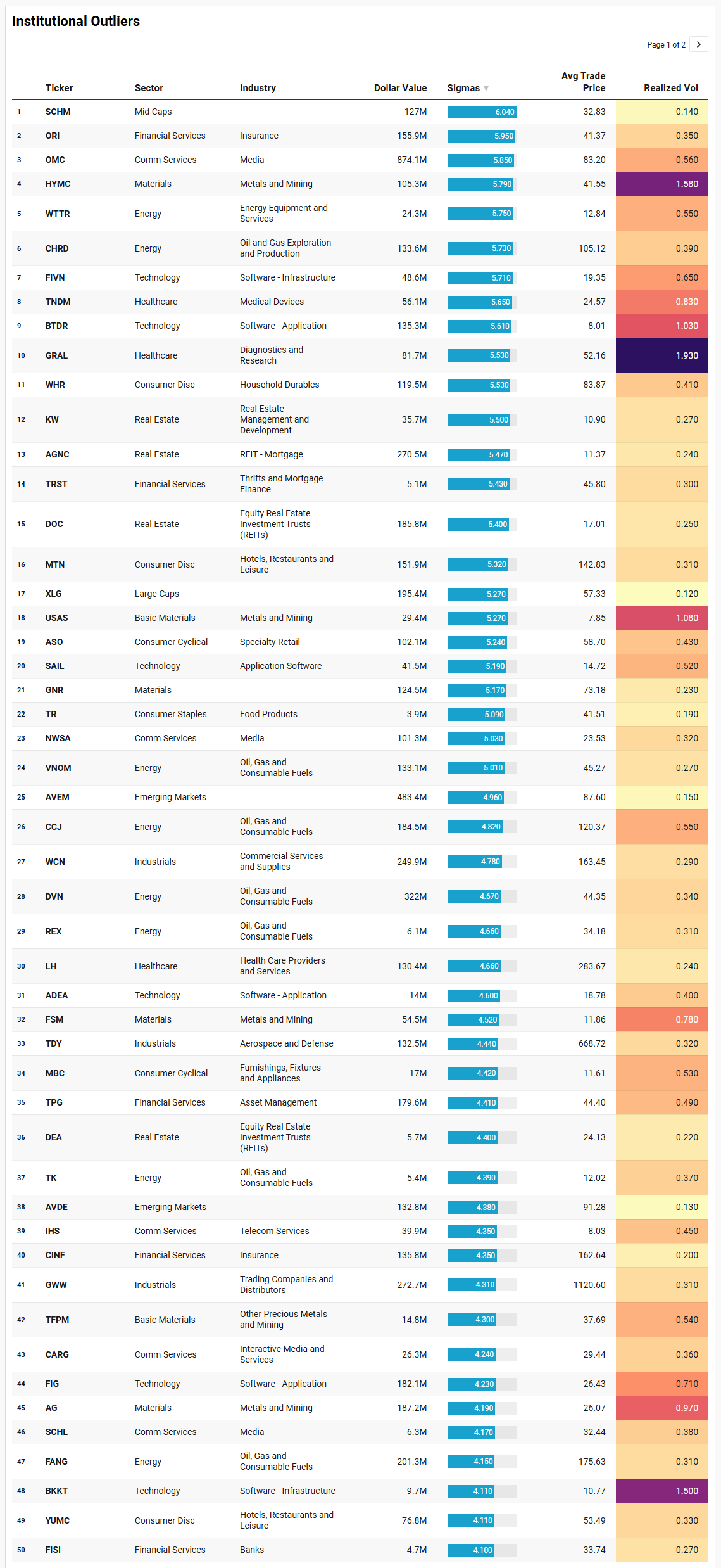 Real estate is telling a similar story. AGNC and DOC both show nine‑figure dollar prints with five‑plus sigma readings, joined by KW, DEA, and FRT. Mortgage REITs and high‑quality shopping‑center REITs do not get that kind of attention unless institutions are explicitly reallocating into income and rate‑sensitive vehicles. With the curve still elevated and the Fed in no rush to cut, that looks like a “get paid while we wait” trade rather than a speculative flip.