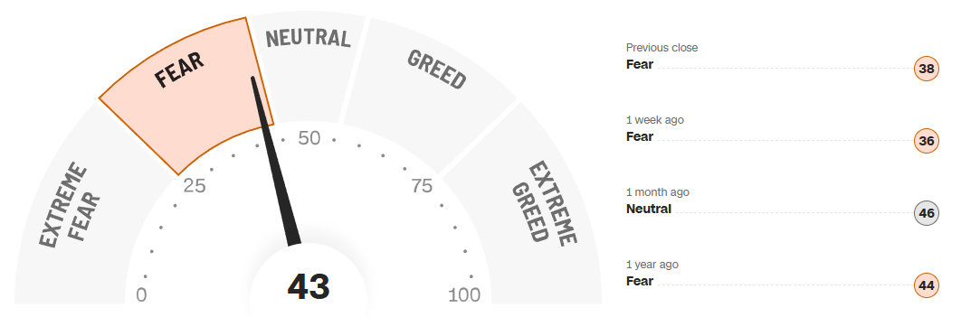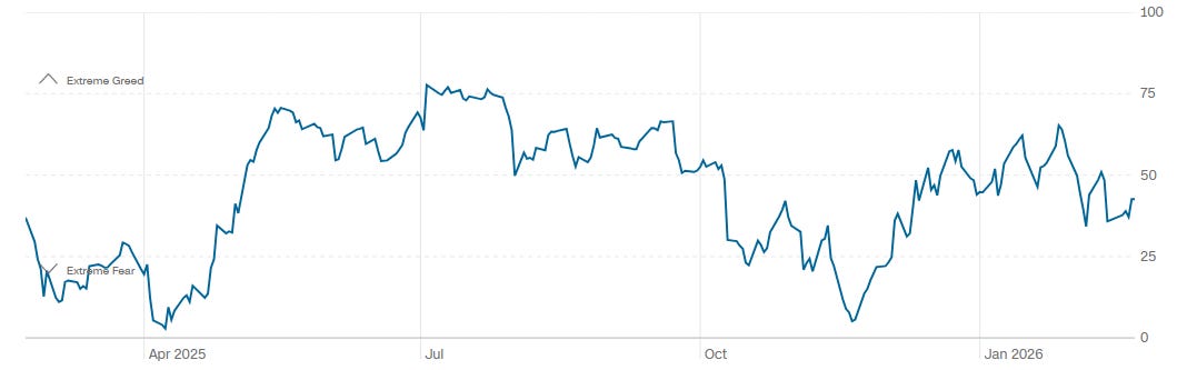 The CNN Fear & Greed index sits at 43 today, labeled “Fear,” up from 38 at the prior close and 36 one week ago, but below the 46 “Neutral” reading one month ago and roughly in line with the 44 print a year ago. The one-year history shows oscillations between fear and greed without spending much time at the extreme ends of the dial; recent months have seen repeated pushes into the upper half of the range fade back toward neutral-to-fear rather than translate into runaway euphoria. Put together, that says the mood is cautious but not panicked: investors are uneasy enough to leave some room for positive surprise, yet not so depressed that we can talk about an obvious capitulation low. A drop of this gauge into the 20s, especially if accompanied by widening credit spreads or a VIX push over the high teens, would mark a better contrarian entry zone. Conversely, another run into the 75+ “Extreme Greed” band would signal exhaustion risk, where incremental good news is more likely to be sold than chased.