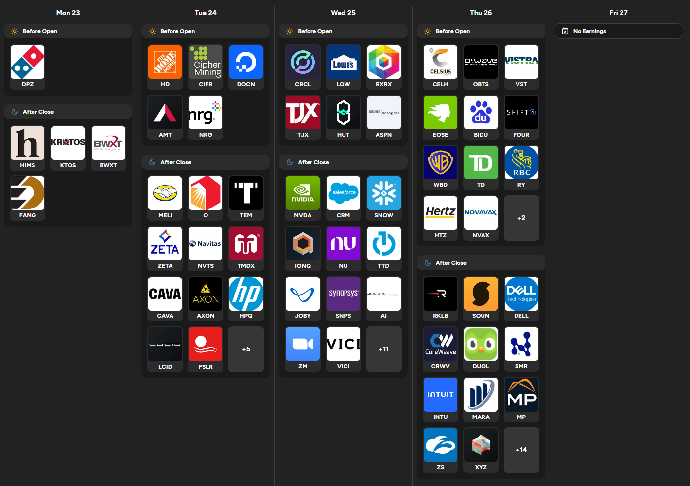 On earnings, the action is front-loaded and tech-heavy. Tuesday night features Home Depot, HP, and a cluster of high-beta names like CAVA, AXON, and several small-cap growth stories; for macro read-through, watch HD’s comps and guidance as a proxy for goods spending and home improvement, and HP’s PC/printer commentary as a cyclical demand gauge. Wednesday after the close is the main event with NVIDIA, Salesforce, Snowflake, IonQ, and others stacked together; NVIDIA’s data center and gaming lines will set the tone for semis and AI, while Salesforce and Snowflake guide the broader enterprise software and cloud complex. Thursday brings Warner Bros. Discovery plus Canadian banks TD and RBC before the open, and Dell, Intuit, and Zscaler after the close; streaming engagement, capital markets commentary, tax and small-business demand, and security spend all feed into how durable this earnings cycle really is. There are no marquee names on Friday, so any late-week gap will come from PPI and Chicago PMI, not micro headlines.