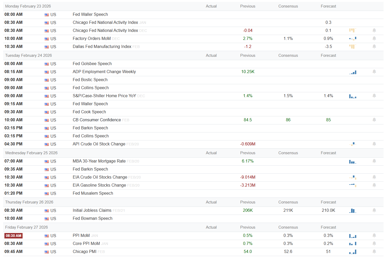 Friday is inflation and activity in one burst. Headline PPI MoM for January shows a previous 0.5 percent with both consensus and forecast at 0.3 percent; any upside surprise back toward 0.5 percent or higher would be classic risk-off via rates, with financials and value holding up better than long-duration tech. Core PPI has a prior 0.7 percent with 0.3 percent consensus and 0.2 percent forecast; a cooler print here would be the cleaner risk-on cue. Chicago PMI rounds out the week with a prior 54.0, consensus 52.6, and forecast 51; holding north of 50 keeps the “expansion but cooling” story intact, while a break toward or below 50 would resurrect growth-scare volatility.