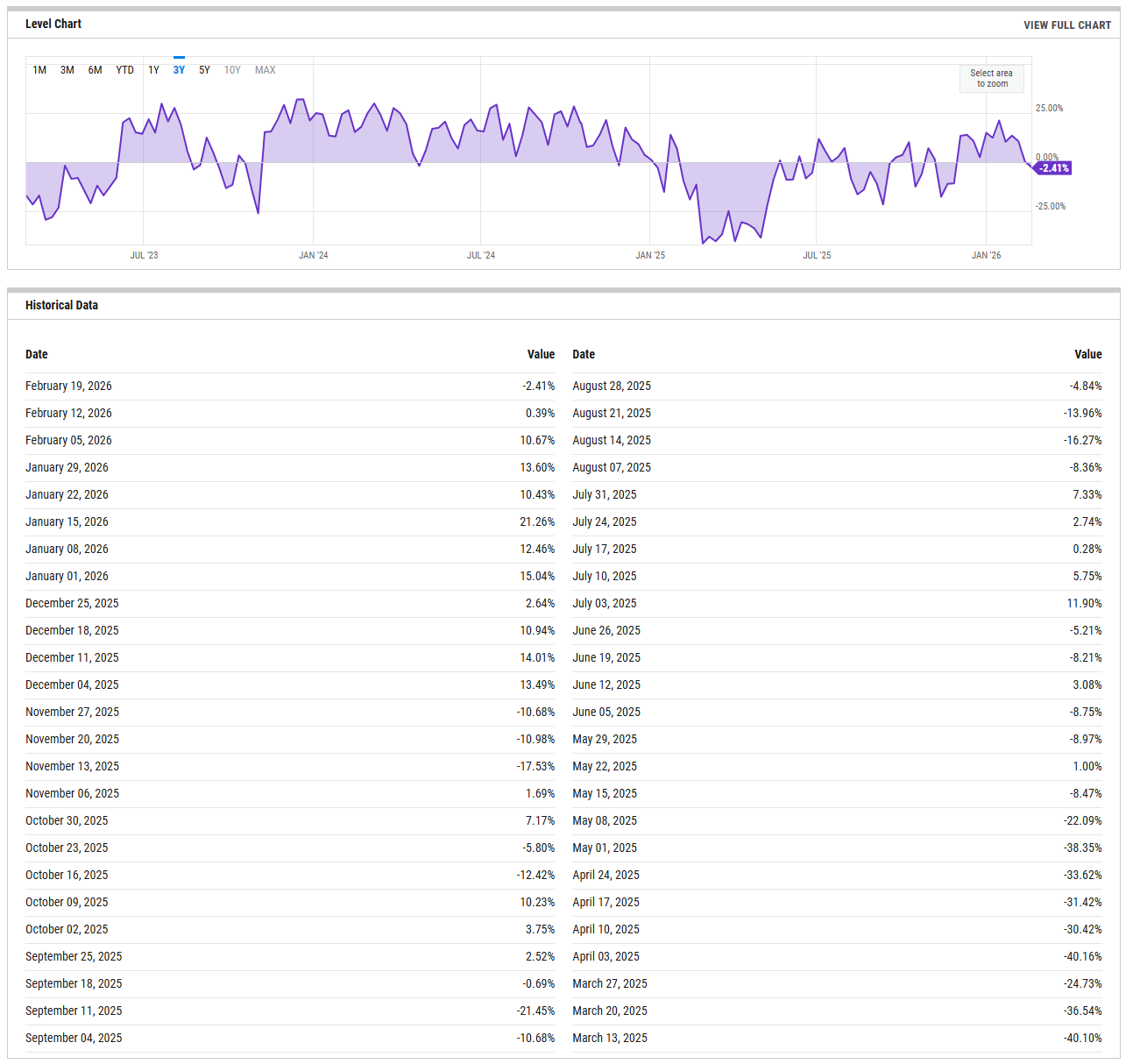 The AAII-style percent bull minus bear spread is not shown numerically here, but the one-year line tracks a move from deep negative territory last spring into the 40–70 zone by mid-2025, followed by a choppy drift lower into the mid-range over the past several months. The current reading sits around the middle of the band, well off last year’s extremes of pessimism and also shy of the peak optimism seen in mid-2025. That leaves sentiment neither a clear contrarian tailwind nor a major headwind; it says investors are optimistic, but not wildly so. From a tactical standpoint, a push back above roughly +30 on the spread would start to feel crowded and raise the odds of disappointments biting harder, while any slide back toward zero or negative territory without a major price break would set up a higher-probability rebound window.